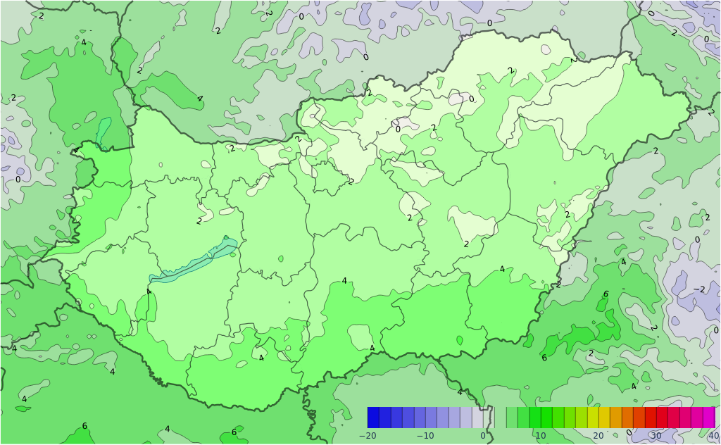 Szombaton a fátyol- és gomolyfelhők mellett általában többórás napsütés várható, majd észak felől egy markáns hidegfront felhőzete vonul át az ország fölött. Felhőzetéből elsősorban az ország keleti felében valószínű zápor, északkeleten, keleten helyenként zivatarok is lehetnek. Az északi, északnyugati irányba forduló szél sokfelé megerősödik, többfelé viharos lökések is kísérhetik. A minimum-hőmérséklet általában 3, 9 fok között valószínű, de a szélvédett, kevésbé felhős helyeken ennél pár fokkal hidegebb is lehet. Délután jellemzően 14, 21 fok valószínű.