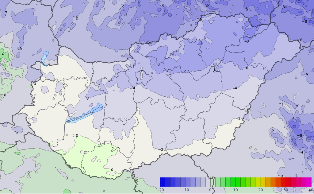 Kedden nagyobbrészt erősen felhős lehet az ég, keleten azonban kevésbé felhős tájak is lehetnek. A nyugati megyékben kisebb havazás, ónos eső előfordulhat egy melegfrontnak köszönhetően. A minimum-hőmérséklet általában -15, -7 fok között valószínű, de a derült, szélcsendes helyeken -15 foknál is hidegebb lehet. Kora délután -9, 0 fok valószínű, nyugaton a magasabb értékekkel.