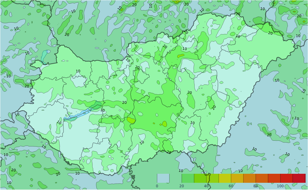 Hétfőn éjszaka tovább csökken a felhőzet, a szélcsendes részeken pára-, ködfoltok képződhetnek. Napközben a Tiszántúlon több lesz a felhő, másutt gyengén felhős, napos idő várható. Gyenge záporeső is inkább északkeleten, keleten fordulhat elő az is főleg éjszaka, nappal már csak kevés helyen eshet. A déliesre forduló szél időnként megélénkül. A hőmérséklet a hajnali 7, 16 fokról délutánra 20, 25 fok közé emelkedik.