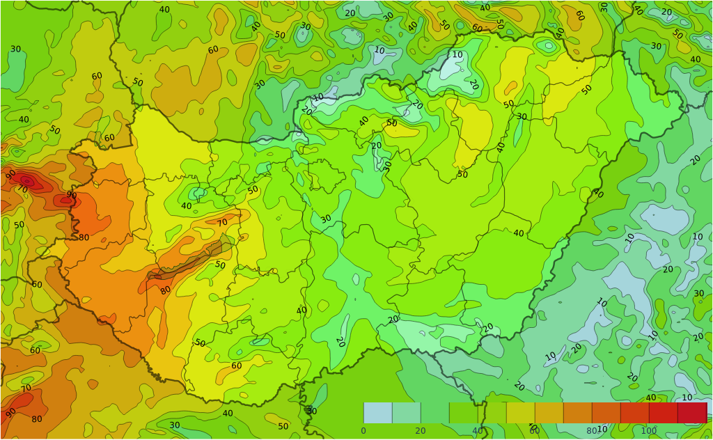 Pénteken az ország nyugati felén nagyrészt erősen felhős vagy borult marad az ég és többfelé várható eső, zápor. Keletebbre a gomoly- és fátyolfelhők mellett általában többórás napsütésre számíthatunk, és a záporok mellett zivatarok is kialakulhatnak, amelyeket helyenként felhőszakadás kísérhet. A Dunántúlon élénk, helyenként erős lesz az északi, északnyugati szél, de a zivatarokat is kísérhetik erős, viharos lökések. A legmagasabb nappali hőmérséklet a borongós, csapadékos Dunántúlon 14 és 19, míg a naposabb keleti részeken 20 és 25 fok között valószínű. Késő este 11, 16 fokra számíthatunk.
