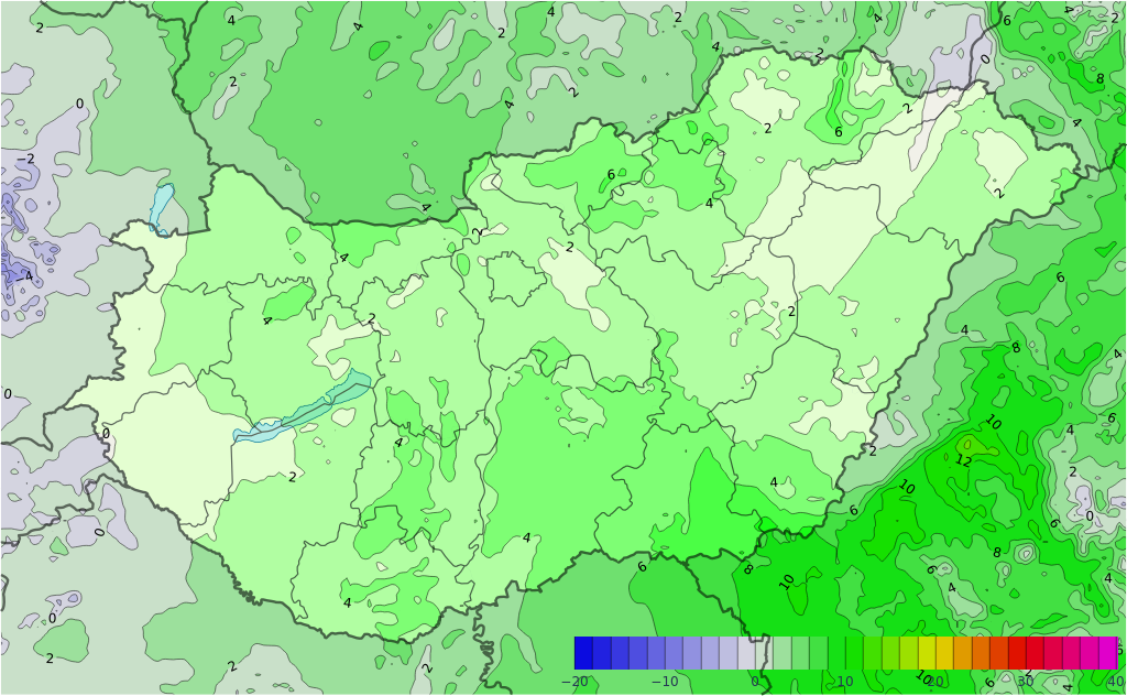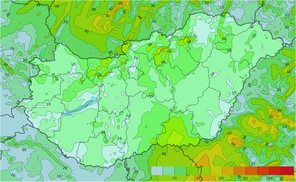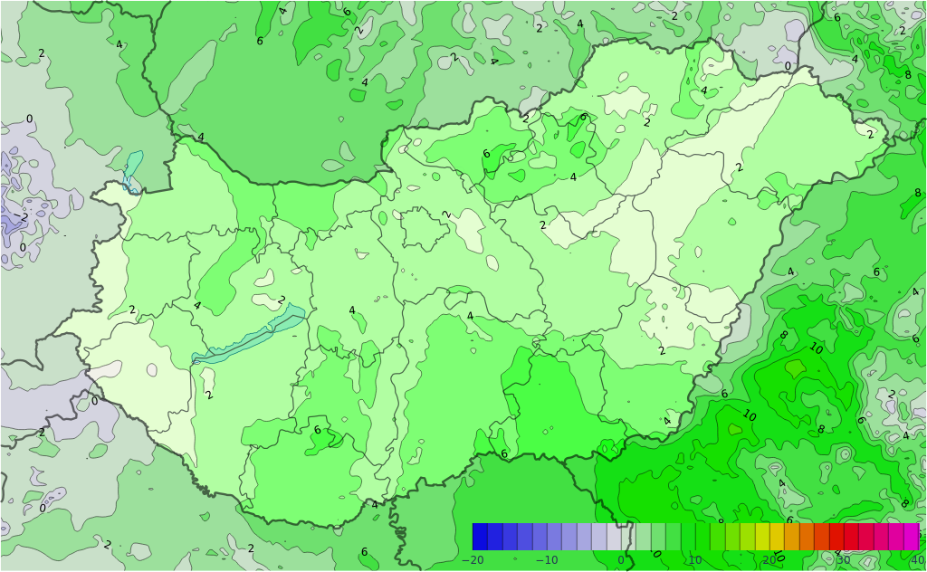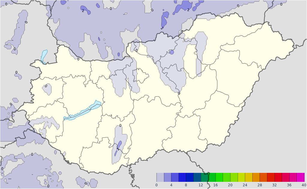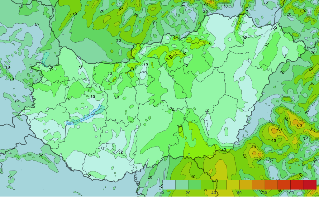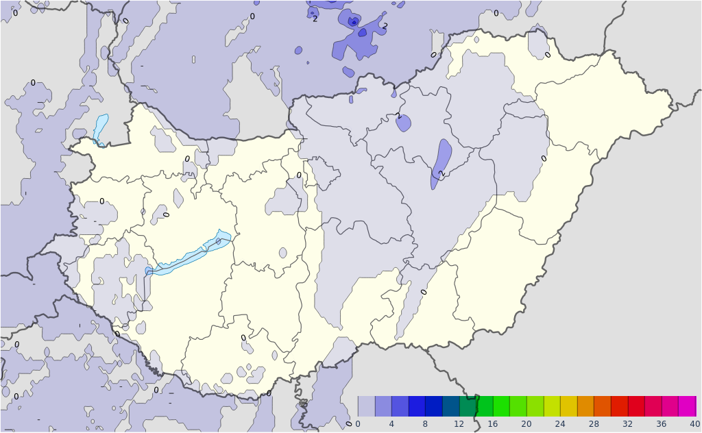 Hétfőn a látási viszonyok általában javulnak, a Dunántúlon a köd ritkulhat, illetve a rétegfelhőzet szakadozhat – ott hosszabb-rövidebb időre a nap is kisüthet, míg másutt marad az általában erősen felhős vagy borult, párás idő. A csapadékzóna reggelre várhatóan elhagyja a Dunántúlt, és lassan araszol kelet felé, a Tiszántúlon még este is többfelé várható eső, záporeső. Az északiasra forduló szél többnyire gyenge vagy mérsékelt marad. Kora délután általában 3 és 10 fok közé melegszik fel a levegő, de az északi, északnyugati és nyugati peremterületeken néhol ennél kissé hidegebb maradhat. Késő este 1, 6 fok valószínű.