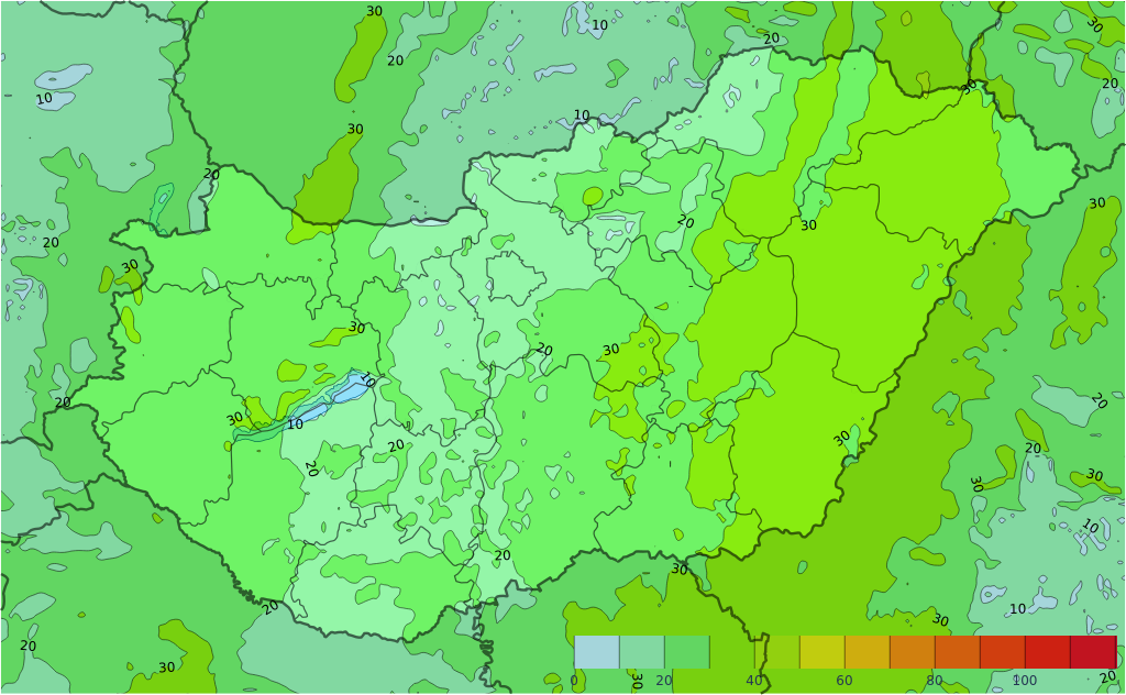 Kedden változó vastagságú felhőzóna vonul nyugatról kelet felé. Emellett hazánk nagy részén több-kevesebb napsütés is várható. Több helyen előfordul eső, zápor, eleinte a Dunántúlon, a nap második felében a Dunától keletre is. Helyenként zivatar is kialakulhat. A déli, délkeleti szél sokfelé megélénkül, zivatar térségében erős lökések is várhatók. Hajnalban többnyire 6, 14, délután általában 22, 27 fokot mérhetünk, de a nyugati csapadékos tájakon hűvösebb lehet.