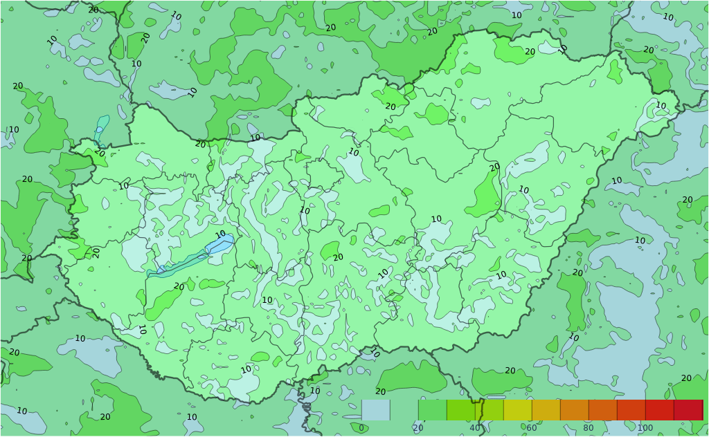 A déli, délnyugati szél többfelé megélénkül, a Dunántúlon helyenként meg is erősödik. A legmagasabb nappali hőmérséklet általában 15 és 19 fok között valószínű.
