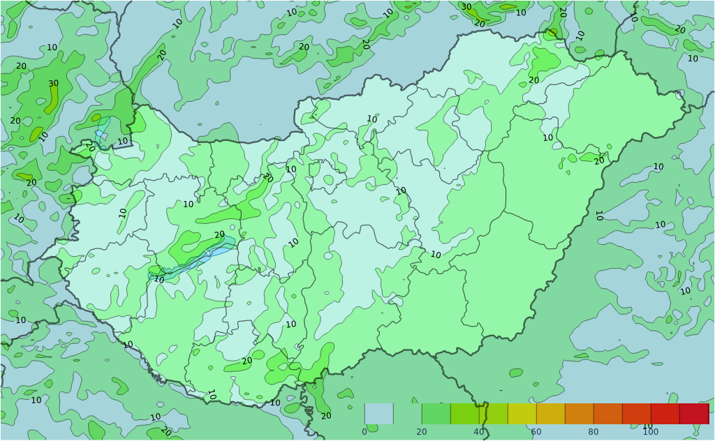 Vasárnap általában felhős, borult idő várható, viszont átmeneti szakadozások lehetnek a felhőzetben, hosszabb-rövidebb napos időszakokkal. Délután a Dunántúlon átmenetileg jobban is felszakadhat a felhőzet, több órára kisüthet a nap. Kisebb eső, zápor valószínű, melyre délelőtt inkább a Dunántúlon, majd a déli óráktól a középső országrészben és keleten lehet számítani. Számottevő mennyiségű csapadék viszont elsősorban az esti óráktól északkeleten várható. Az északnyugati, nyugati irányú szél a Dunántúlon nagy területen megerősödik, északnyugaton viharos lökések is kísérhetik. Az ország keleti harmadán ugyanakkor gyenge vagy mérsékelt marad a légmozgás. A legmagasabb nappali hőmérséklet 12 és 18 fok között alakul.