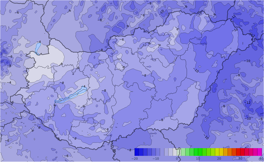 Hétfőn reggel az északkeleti negyedben erősen felhős, másutt derült vagy kissé felhős lesz az ég. Északkeleten csökken a felhőzet, de az ukrán határszélen végig felhős marad az ég. Az Észak-Alföldön és a Zemplénben havazás is várható, amelynek az intenzitása és a területi kiterjedése is fokozatosan csökken, de helyenként estig kitart. Ezzel együtt a déli óráktól NY felől mindenhol megnövekszik a felhőzet, késő estére mindenhol beborul az ég. Ebből estétől északnyugaton várható havazás, a Nyugat-Dunántúlon ónos eső is. Az élénk északnyugati szél mérséklődik, és délire, délnyugatira fordul. A legalacsonyabb éjszakai hőmérséklet többnyire -12 és -6 fok között valószínű, de tartósan derült, szélcsendes részeken ennél több fokkal hidegebb, akár -20 fok körüli hőmérséklet is lehet. A legmagasabb nappali hőmérséklet -9, -1 fok között várható.