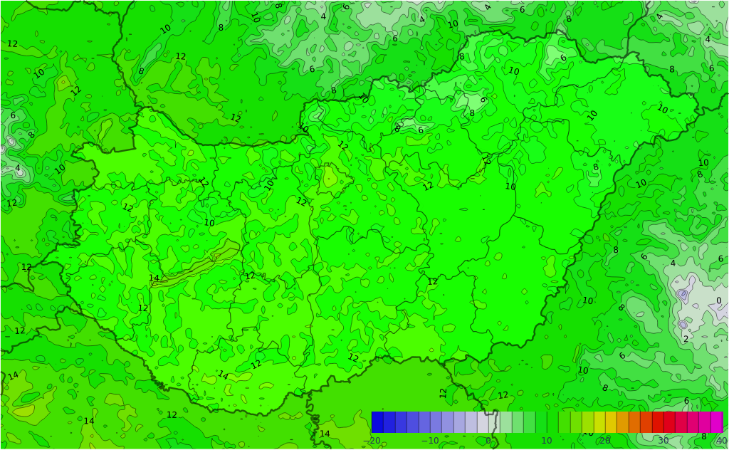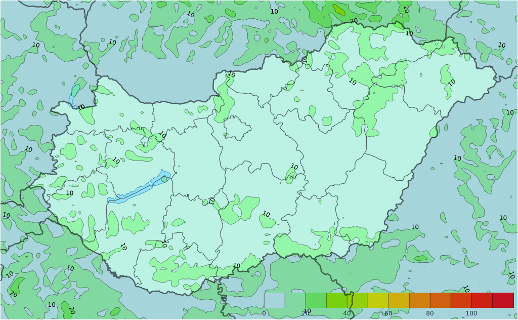 legkisebb eséllyel az északnyugati tájakon és a Tiszántúlon alakulhat ki csapadék. A délies szél az Északnyugat-Dunántúlon északiasra fordul, és főként a Dunántúlon, illetve csapadékgócok környezetében élénk, akár erős széllökés is előfordulhat. A legmagasabb nappali hőmérséklet 14 és 19 fok között alakul. Késő este 4, 9 fok valószínű.