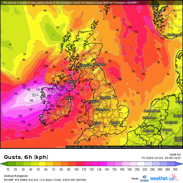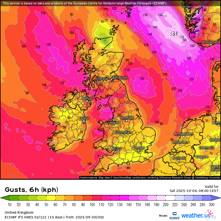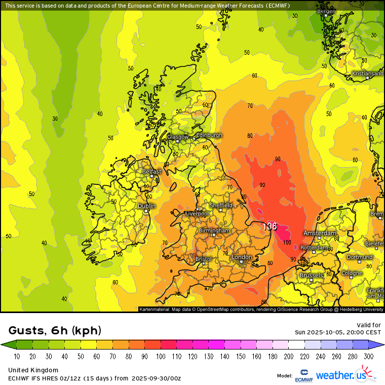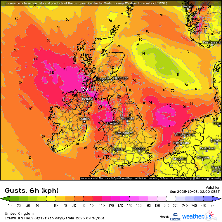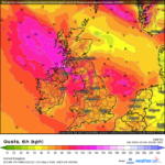 Az alábbi képre kattintva egy galéria jelenik meg, amelyben az ECMWF időjárás-előrejelző modell széllökés prognózisát láthatjuk a Brit-szigetek térségére. A térképektől jobbra olvasható, hogy mely időpontra vonatkozik az előrejelzés.