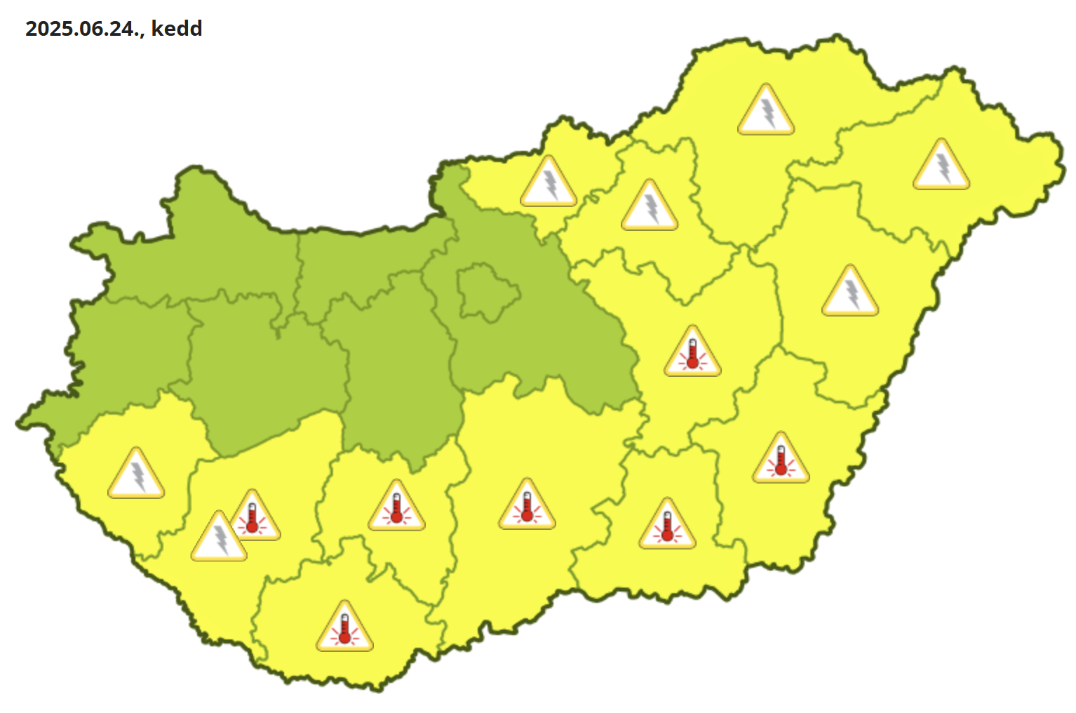 Zivatar miatt kedden Nógrád, Heves, Borsod-Abaúj-Zemplén, Szabolcs-Szatmár-Bereg, Hajdú-Bihar és Zala, valamint Somogy vármegyében érvényes elsőfokú figyelmeztetés, míg a magas középhőmérséklet továbbra is délen okozhat problémát, Somogy, Tolna, Baranya, Bács-Kiskun, Csongrád-Csanád, Jász-Nagykun-Szolnok és Békés vármegyében érvényes figyelmeztetés.