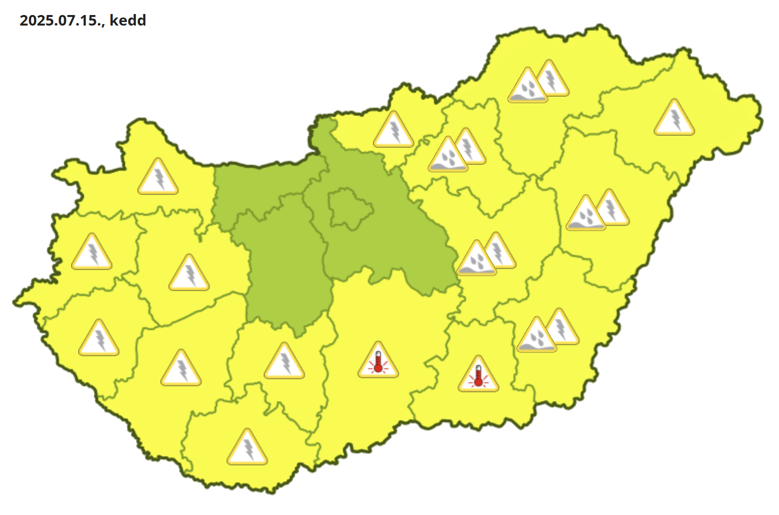 Kedden is zivatarveszély miatt került ki az elsőfokú figyelmeztetés Győr-Moson-Sopron, Vas, Zala, Veszprém, Somogy, Tolna, Baranya illetve Nógrád, Heves, Borsod-Abaúj-Zemplén, Szabolcs-Szatmár-Bereg, Hajdú-Bihar, Jász-Nagykun-Szolnok és Békés vármegyére, de az ország keleti részén, Heves, Borsod-Abaúj-Zemplén, Hajdú-Bihar, Jász-Nagykun-Szolnok és Békés vármegyében felhőszakadással kiegészülve. A meleg Bács-Kiskun és Csongrád-Csanád vármegyére korlátozódik már.