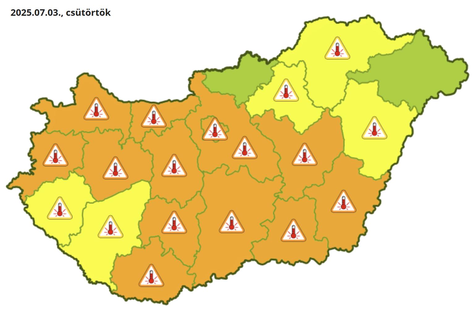 A Hungaromet másodfokú figyelmeztetést adott ki a hőség miatt Győr-Moson-Sopron, Komárom-Esztergom, Vas, Veszprém, Fejér, Tolna, Baranya, Pest, Jász-Nagykun-Szolnok, Bács-Kiskun, Csongrád-Csanád és Békés vármegyére. Somogy, Zala, Heves, Hajdú-Bihar és Borsod-Abaúj-Zemplén vármegyében pedig elsőfokú figyelmeztetés érvényes csütörtökön.