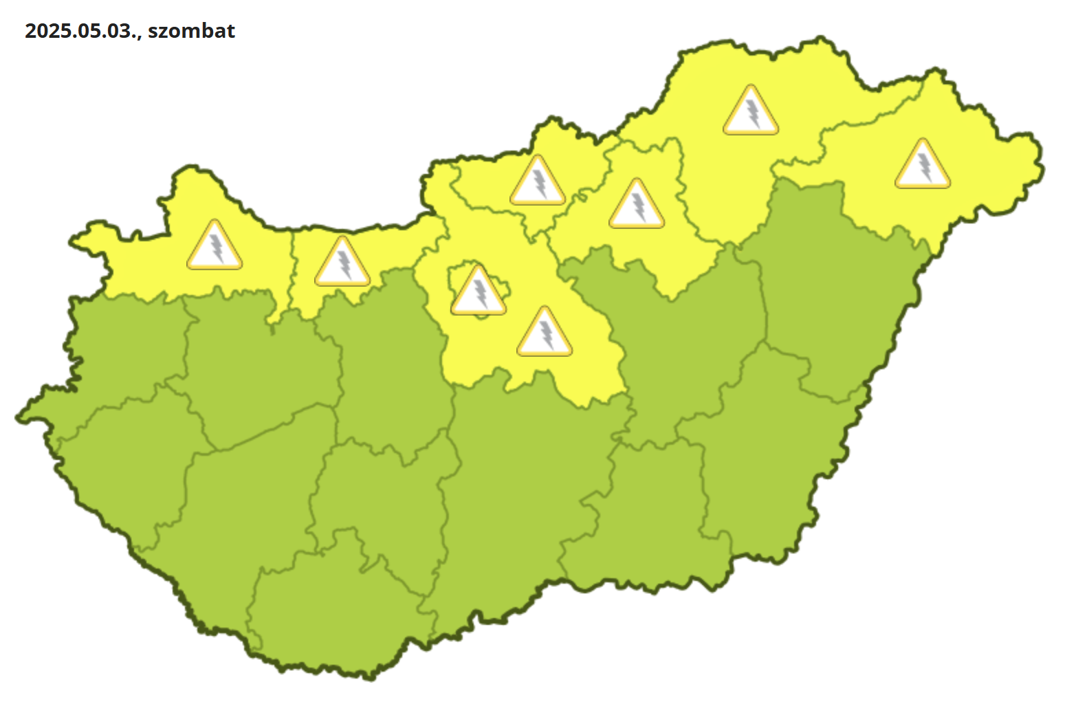 Zivatar veszélye miatt Győr-Moson-Sopron, Komárom-Esztergom, Pest, Nógrád, Heves, Borsod-Abaúj-Zemplén és Szabolcs-Szatmár-Bereg vármegyében elsőfokú figyelmeztetés érvényes szombaton.