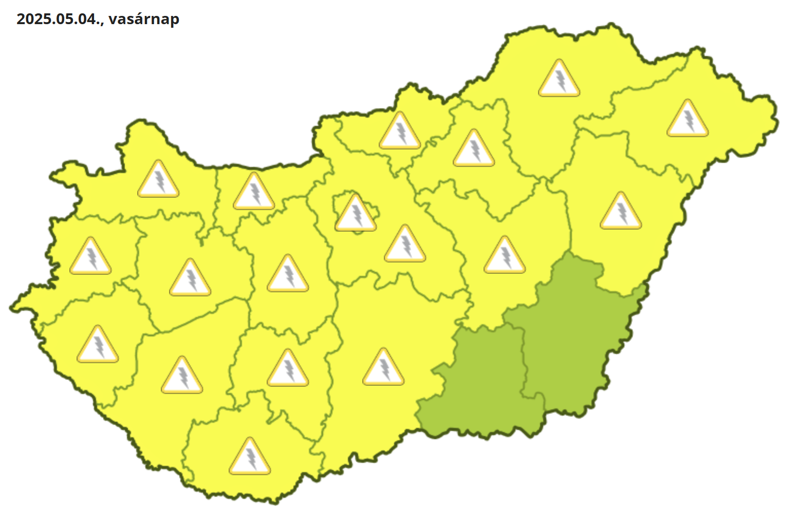 Vasárnapra a HungaroMet Békés és Csongrád-Csanád vármegye kivételével az egész országra elsőfokú figyelmeztetést adott ki a zivatarok veszélye miatt.
