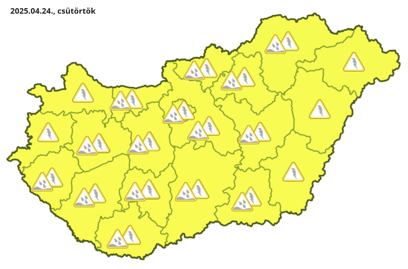 Csütörtök délelőttől döntően a Dunántúl keleti felében és a középső országrészben egyre többfelé várhatóak tartósan zivatarok. Délutántól késő estig emellett az ország északkeleti felében szórványosan, délekeleten helyenként várhatóak zivatarok kialakulása. A zivatarok környezetében felhőszakadás (> 30 mm) kialakulhat, illetve a tartósan képződő zivatarok hatására késő estig a középső orszgrészben, a Dunántúl keleti felében, illetve az Északi-Középegység környezetében lokálisan 30-50 mm, a középső részeken akár efeletti csapadék is hullhat. A zivatarok környezetében helyenként viharos szél (60-75 km/h), jégeső (<=1 cm) kialakulhat.