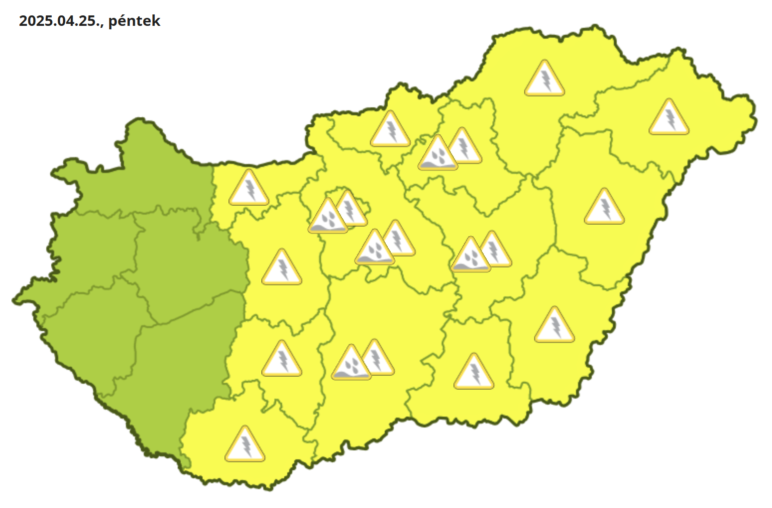 Pénteken még mindig elsőfokú figyelmeztetés érvényes a nyugati területek, Győr-Moson-Sopron, Vas, Veszprém, Zala és Somogy vármegye kivételével zivatar veszélye miatt az ország többi részére. Felhőszakadás Pest, Bács-Kiskun, Heves és Jász-Nagykun-Szolnok vármegyében fordulhat elő.
