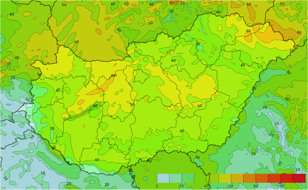 Legerősebb széllökések (km/óra) pénteken, 12 órakor: