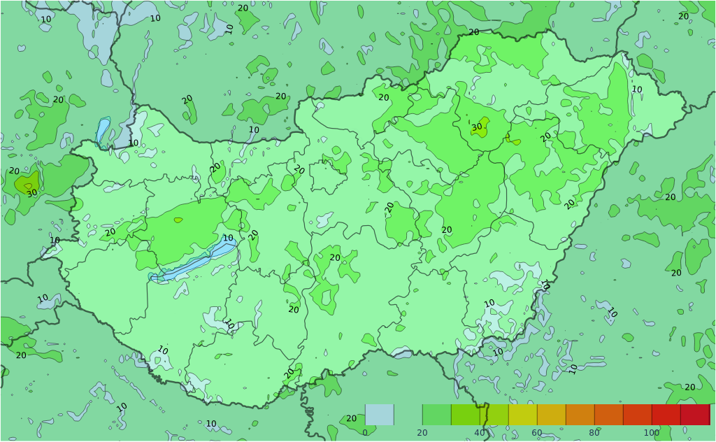 A területi eloszlás ugyanakkor jelentős különbségeket mutatott. A csapadékosabb Dél-Dunántúlon sokfelé 50 milliméter fölé emelkedett a havi összeg, de az Alpokalján és az északkeleti határszélen is előfordultak 50 millimétert meghaladó értékek.