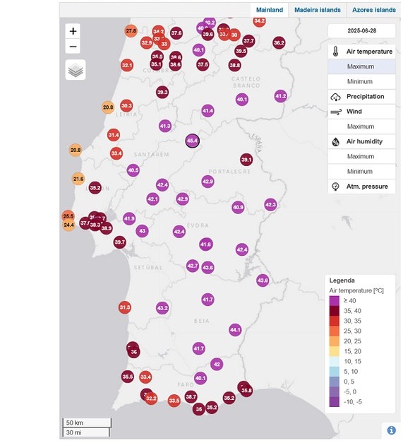 A fenti képeken az portugáliai maximum-hőmérsékleti értékeket láthatjuk 2025. június 28-án.