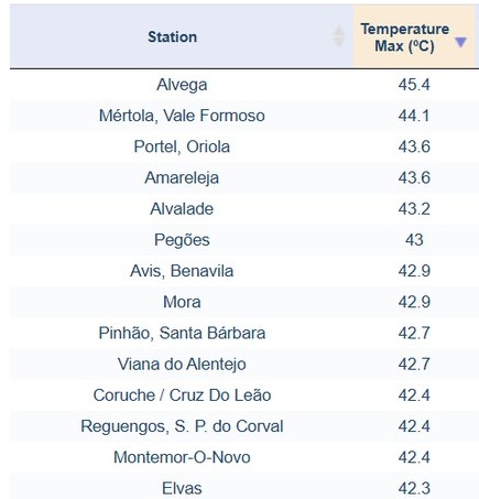 A portugáliai Alvega településen pedig 45,4 °C-on tetőzött a hőmérséklet szombat délután, megdöntve a 44,6 °C-os júniusi országos rekordot, amelyet alig több, mint nyolc éve 2017. június 17-án regisztráltak úgyszintén Alvega-n.