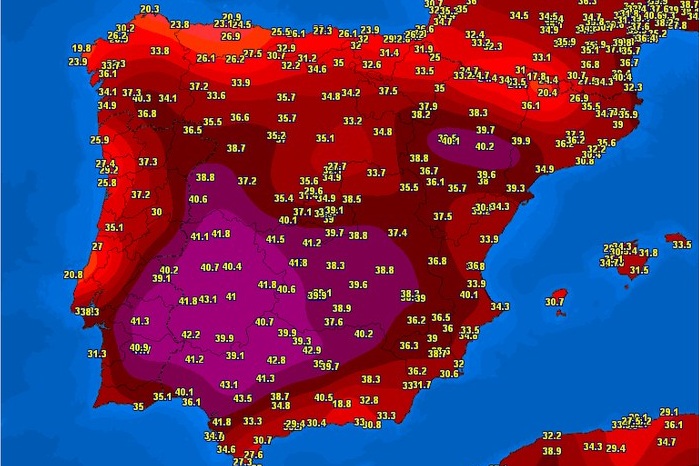 A fenti képen a spanyolországi legmagasabb maximum-hőmérsékleti értékeket láthatjuk 2025. június 28-án.