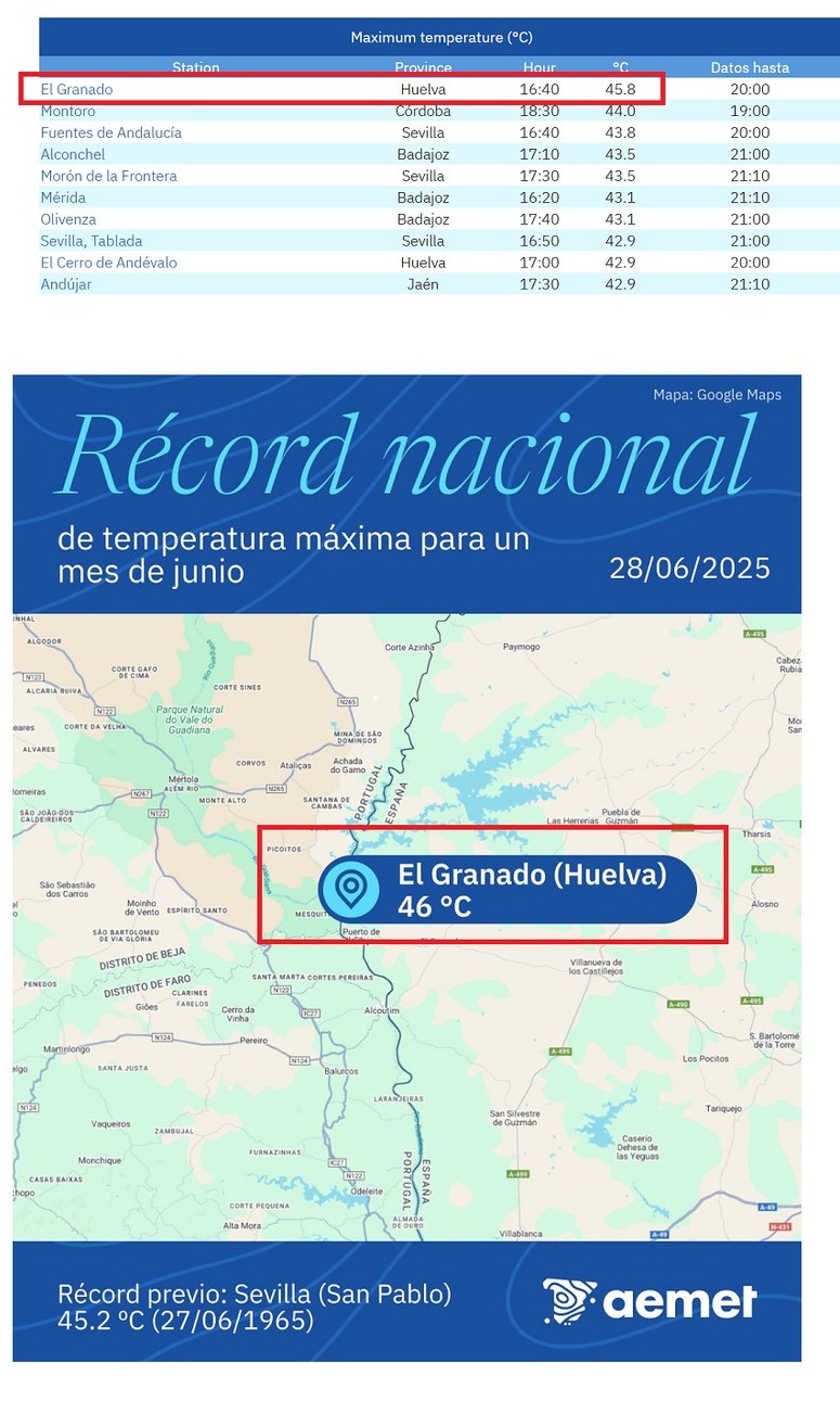 Hazánkban is dőlt már melegrekord a héten, hiszen csütörtök délután 39,7 fokig emelkedett a hőmérséklet, amely csupán három tized fokkal maradt el a 2021-ben mért kerek 40 fokos abszolút júniusi rekordtól. Spanyolországban viszont nem maradt el a rekorddöntés hiszen június 28-án, szombaton El Granado településen 45,8 °C-ig emelkedett a hőmérséklet, amely új spanyol júniusi nemzeti rekord, megdöntve a 60 évvel ezelőtti (1965. június 27.) Sevillában mért 45,2 °C-os rekordot.