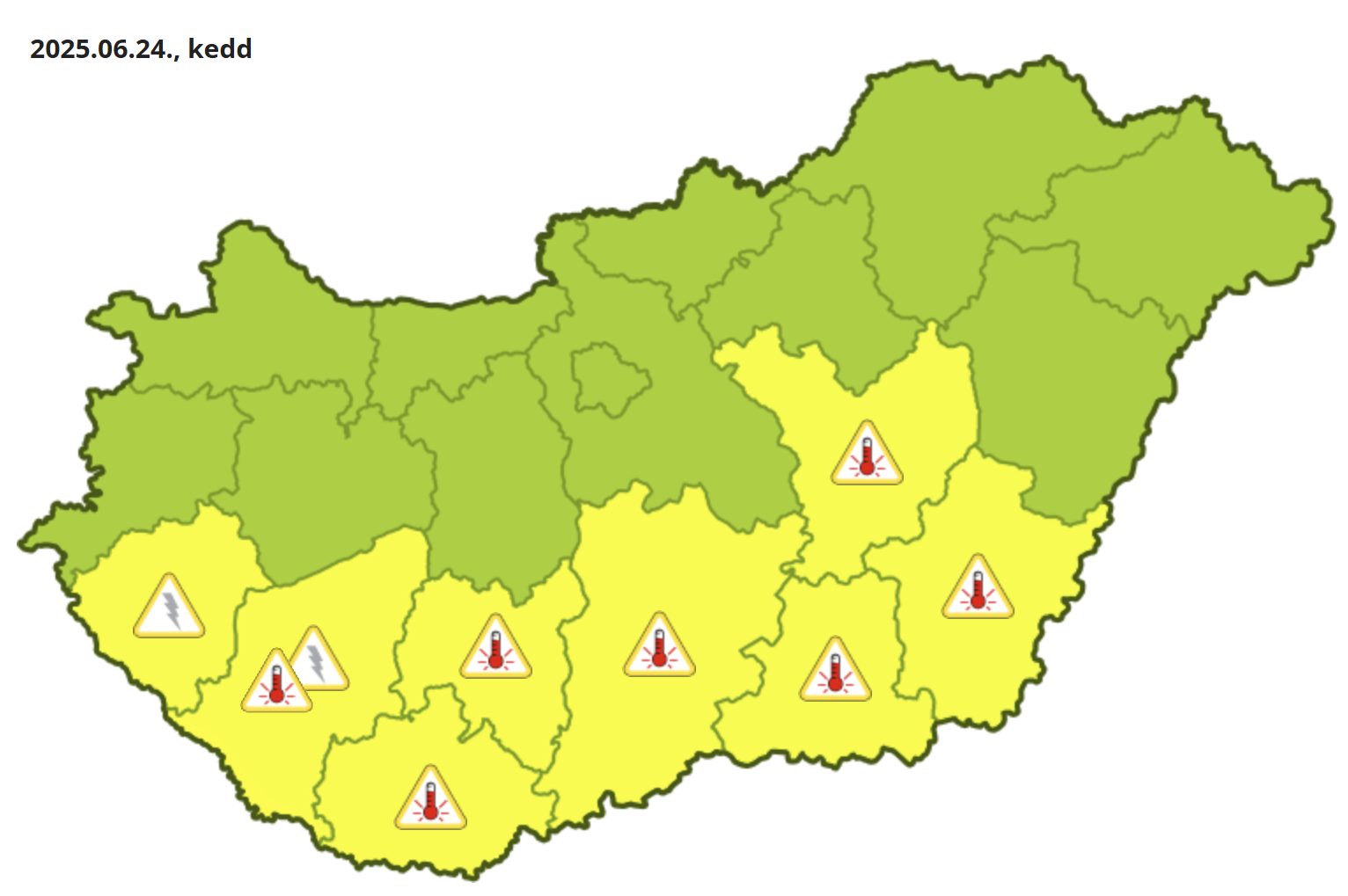 Zivatar miatt kedden Zala és Somogy vármegyében érvényes elsőfokú figyelmeztetés, míg a magas középhőmérséklet délen okozhat problémát, Somogy, Tolna, Baranya, Bács-Kiskun, Csongrád-Csanád, Jász-Nagykun-Szolnok és Békés vármegyében érvényes figyelmeztetés.