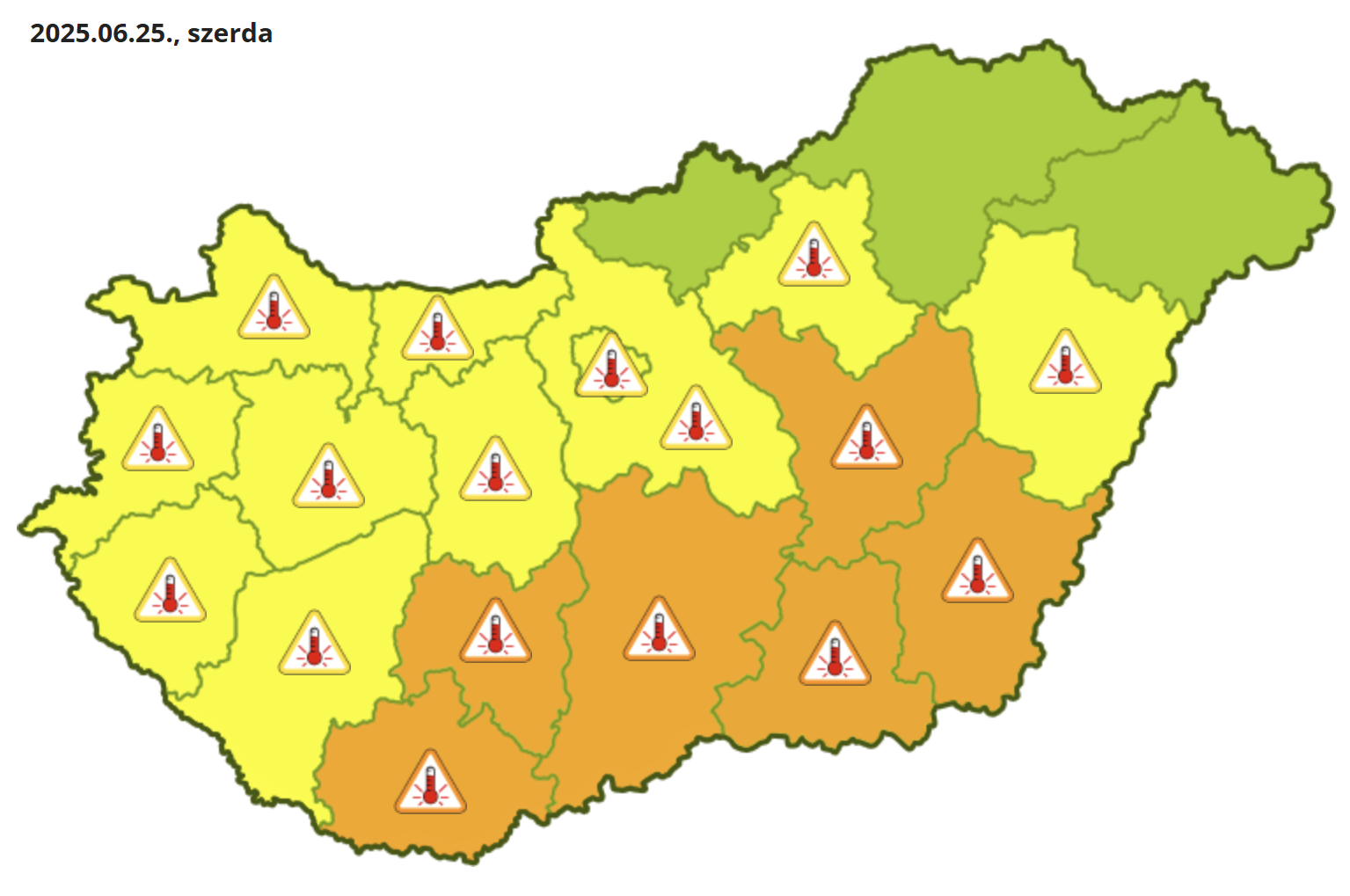 A HungaroMet szinte az egész országra figyelmeztetést adott ki a magas középhőmérséklet miatt. Narancs, azaz másodfokú figyelmeztetés érvényes Tolna, Baranya, Bács-Kiskun, Csongrád-Csanád, Jász-Nagykun-Szolnok és Békés vármegyében, míg Nógrád, Borsod-Abaúj-Zemplén és Szabolcs-Szatmár-Bereg vármegye kivételével az ország többi részére elsőfokú.