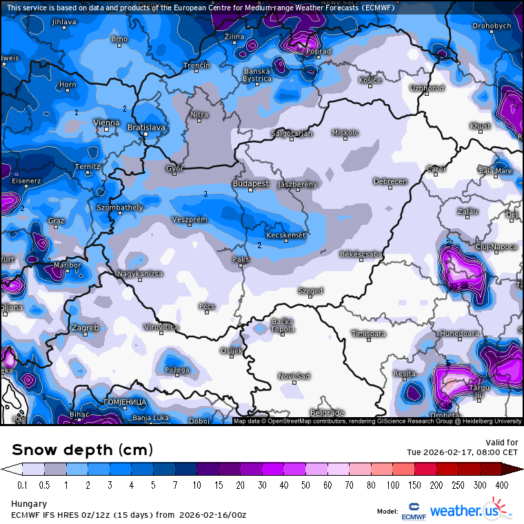 A legtöbb hó, 3-6 cm körüli mennyiség a Szombathely-Kecskemét vonal térségében valószínű.
