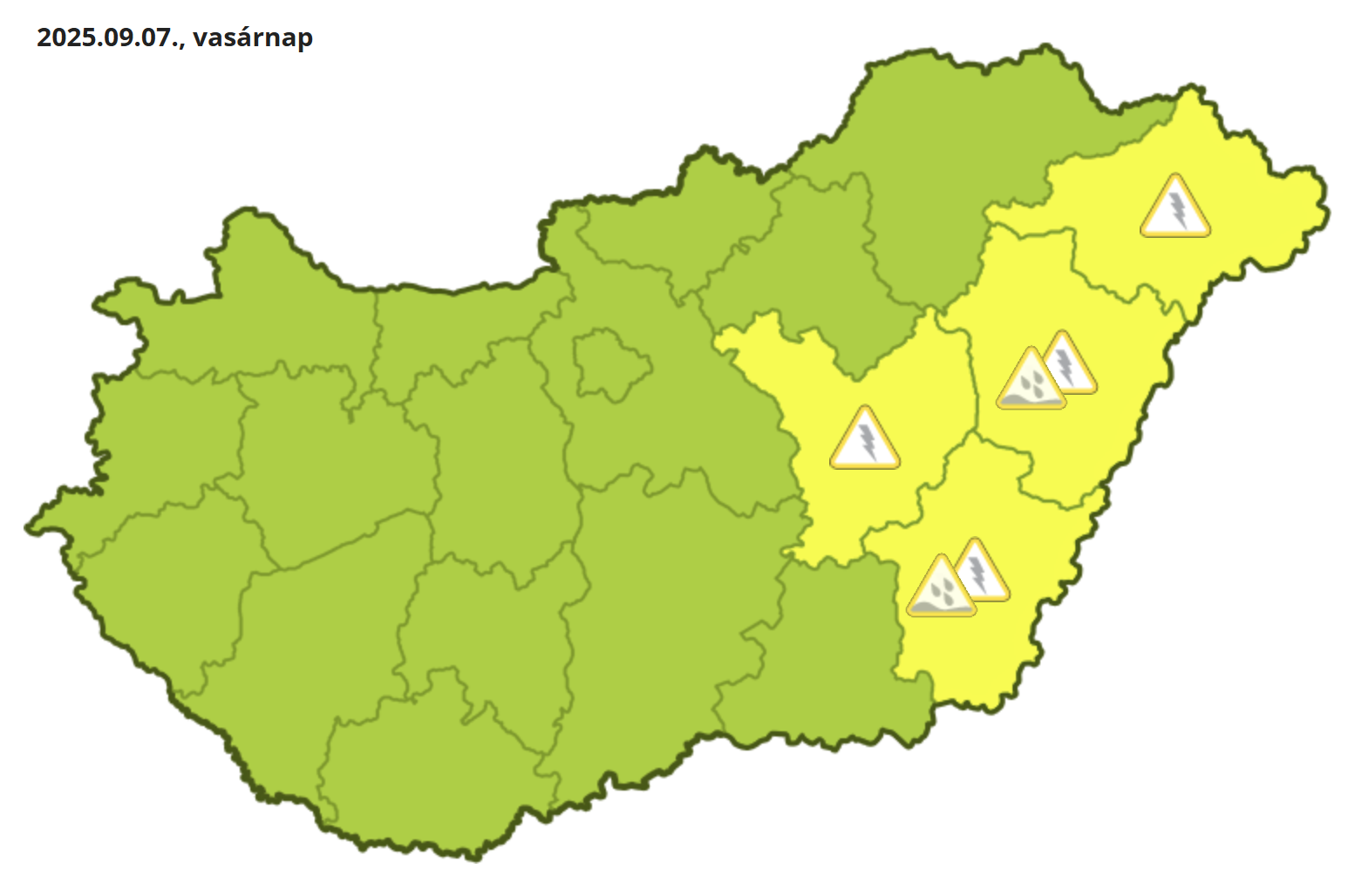 Vasárnap elsőfokú figyelmeztetés érvényes a zivatarok veszélyes kísérőjelenségei miatt Szabolcs-Szatmár-Bereg, Hajdú-Bihar, Jász-Nagykun-Szolnok és Békés vármegyére, felhőszakadás miatt pedig Hajdú-Bihar és Békés vármegyére.