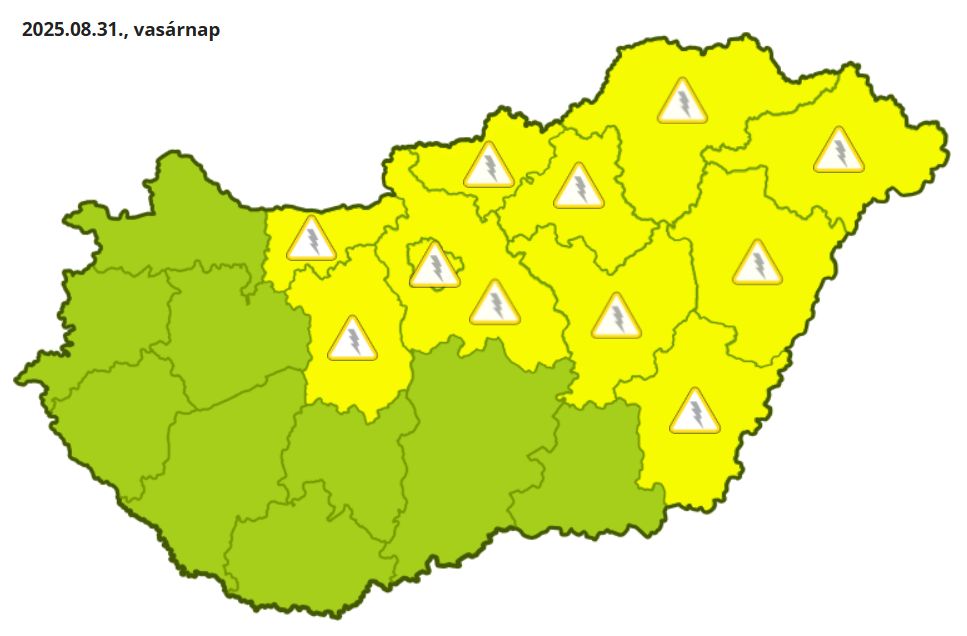 Vasárnap a déli óráktól késő estig jellemzően az ország északkeleti felén, harmadán alakulhatnak ki elszórtan zivatarok, amelyekhez főként intenzív csapadék (10-25 mm) vagy felhőszakadás (30-50, lokálisan > 50 mm) társulhat. A domborzat függvényében villámárvíz is kialakulhat. Emellett szélerősödés (45-65 km/h), esetleg kisméretű jég (< 1-2 cm) is kísérheti a zivatargócokat. A zivatarok veszélyes kísérőjelenségei miatt elsőfokú figyelmeztetés érvényes Komárom-Esztergom, Fejér, Pest, Nógrád, Heves, Borsod-Abaúj-Zemplén, Szabolcs-Szatmár-Bereg, Hajdú-Bihar, Jász-Nagykun-Szolnok és Békés vármegyékben. Felhőszakadás veszélyére Pest, Nógrád, Heves, Borsod-Abaúj-Zemplén, Jász-Nagykun-Szolnok és Hajdú-Bihar vármegyében figyelmeztetnek.