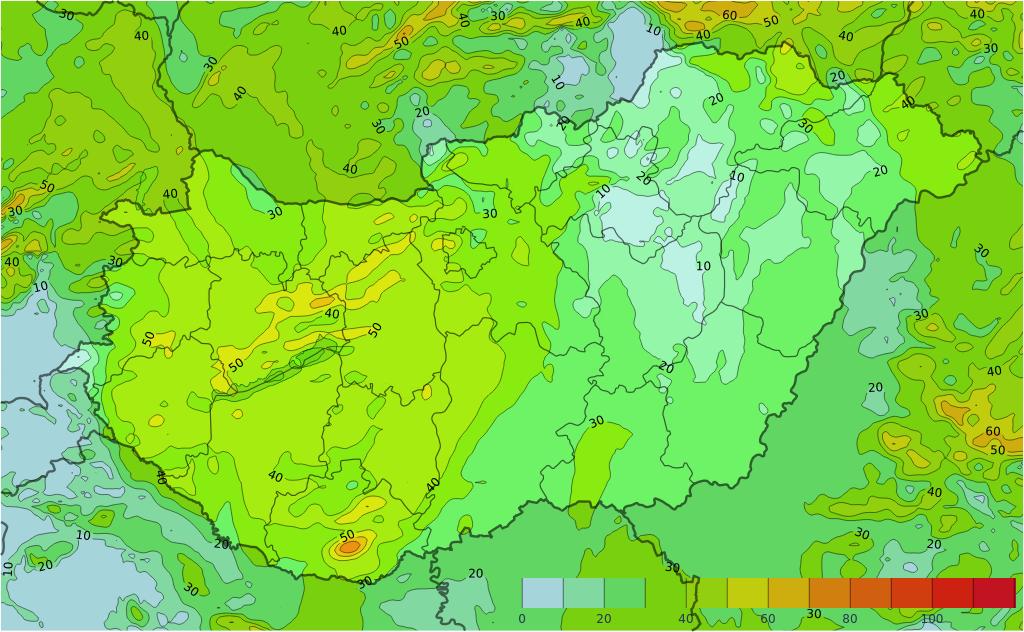 Vasárnap napközben északkeleten (elsősorban az északkeleti határ térségében), illetve főként a Dunántúl magasabban fekvő részein az északnyugati szelet időnként viharos (>70 km/h) széllökések kísérhetik. A hegyvidékek magasabb térszínein 80 km/h feletti széllökések is előfordulhatnak. Estére fokozatosan veszít erejéből a légmozgás.