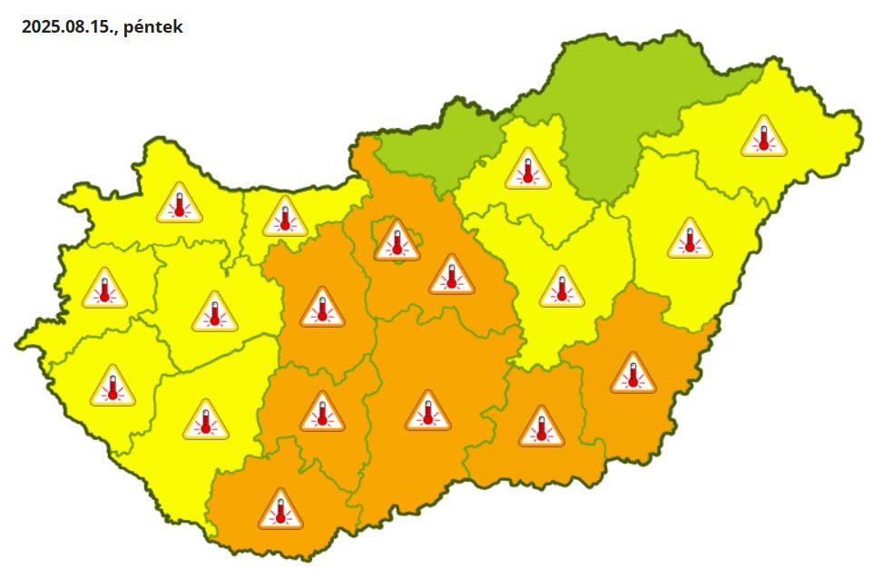 Pénteken már nagyobb területen is 27 fok felett alakulhat a napi középhőmérséklet. Borsod-Abaúj-Zemplén és Nógrád vármegye kivételével országszerte legalább elsőfokú figyelmeztetés érvényes pénteken a magas középhőmérséklet miatt, Fejér, Tolna, Pest, Baranya, Bács-Kiskun, Békés és Csongrád-Csanád vármegyében pedig a másodfokú figyelmeztetés is kiadásra került.
