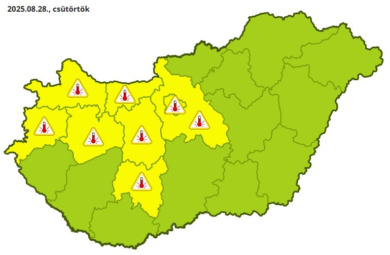 Hungaromet a magas középhőmérséklet miatt elsőfokú figyelmeztetést adott ki Győr-Moson-Sopron, Komárom-Esztergom, Vas, Veszprém, Fejér, Pest és Tolna vármegyére a csütörtöki napra vonatkozóan.