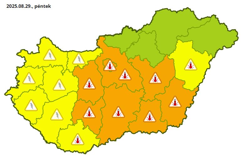 Pénteken tetőzik a kánikula, az északkeleti tájak, valamint a nyugati határvidék kivételével már nagy területen haladhatja meg a napi középhőmérséklet a 25 fokot, sőt a középső országrészben, valamint a Dél-Alföldön a 27 fokot is. Pénteken Fejér, Tolna, Pest, Bács-Kiskun, Jász-Nagykun-Szolnok, Csongrád-Csanád és Békés vármegyében másodfokú figyelmeztetés érvényes a hőség miatt. Győr-Moson-Sopron, Komárom-Esztergom, Vas, Veszprém, Somogy, Baranya és Hajdú-Bihar vármegyében pedig elsőfokú figyelmeztetés érvényes.