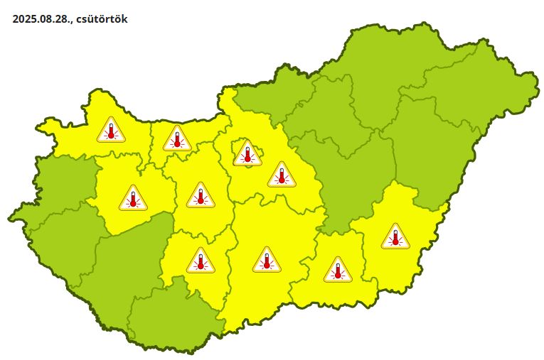 A Hungaromet a magas középhőmérséklet miatt elsőfokú figyelmeztetést adott ki Győr-Moson, Komárom-Esztergom, Veszprém, Fejér, Pest, Tolna, Bács-Kiskun, Csongrád-Csanád és Békés vármegyére a csütörtöki napra vonatkozóan.