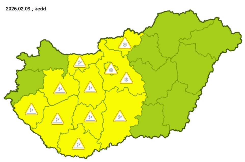 Hétfőn egy-egy intenzívebb hózáporból lokálisan 1-2 cm friss hóréteg kialakulhat, de ekkor jelentősebb hóréteg még nem alakul ki. Kedden a hajnali órákban délnyugat felől csapadékzóna érkezik, amely észak, északkelet felé terjed, és sokfelé okoz vegyes halmazállapotú csapadékot. A Dunántúl déli részein jellemzően ónos eső valószínű, amely esőbe vált. A Dunántúli-középhegységben, a főváros tágabb térségében, illetve az Északi-középhegységben először tartósabb havazás várható, majd (átmeneti) ónos eső eshet, és csak estétől vált esőbe a csapadék. Az Északi-középhegység magasabb térszínein estétől azonban tartósabb lesz az ónos eső, amely csak a szerda reggeli órákra szűnhet meg. A Duna-Tisza közén a kisebb havazás mellett átmeneti ónos eső, majd eső fordulhat elő. Az ónos esőből jellemzően néhány tized mm hullhat, de szerda hajnalig kiemelten az Északi-középhegység magasabban fekvő részein, illetve kedd délutánig néhol a Dunántúlon is az ónos csapadék mennyisége elérheti, meghaladhatja az 1 mm-t. A HungaroMet elsőfokú figyelmeztetést adott ki az ónos eső miatt Baranya, Tolna, Somogy, Fejér, Veszprém, Pest, Nógrád, Komárom-Esztergom, Bács-Kiskun és Zala vármegyére a keddi napra vonatkozóan.
