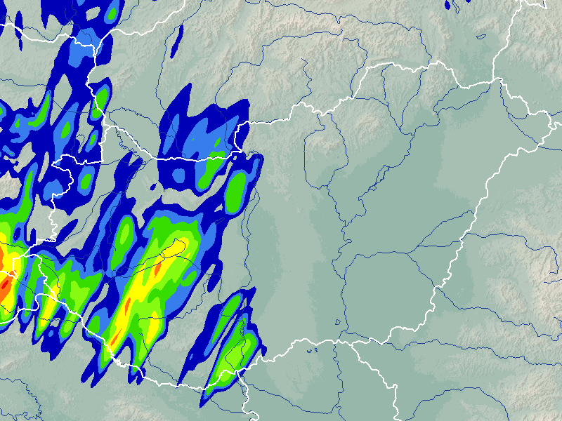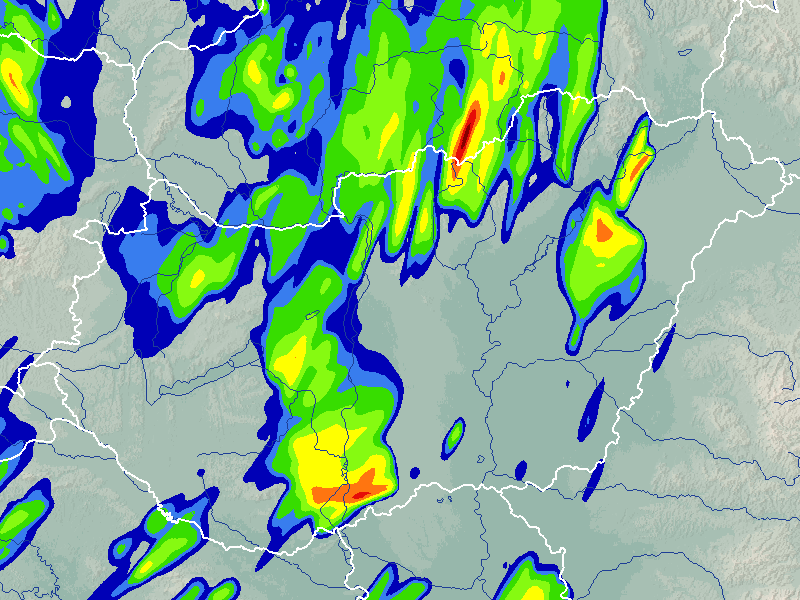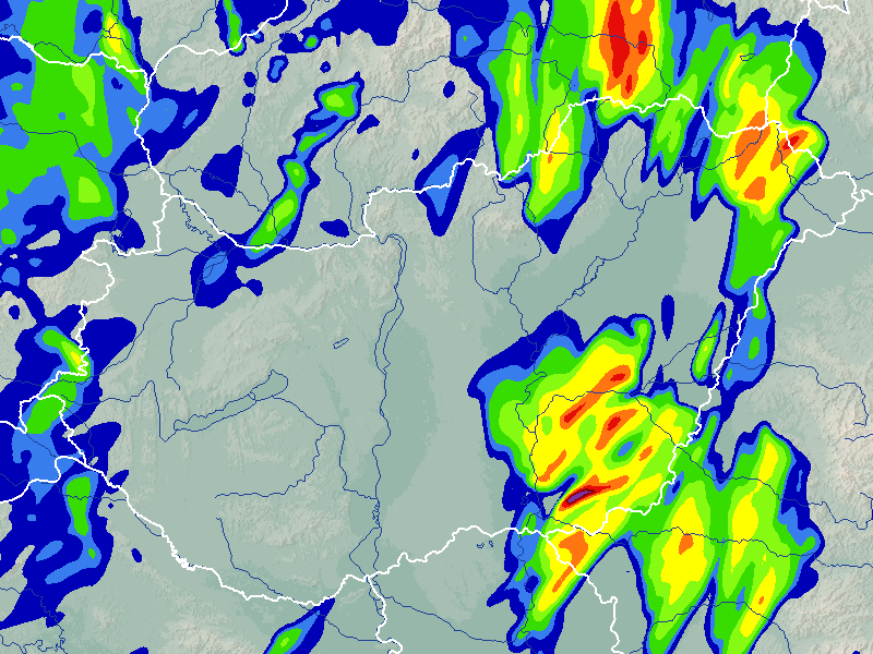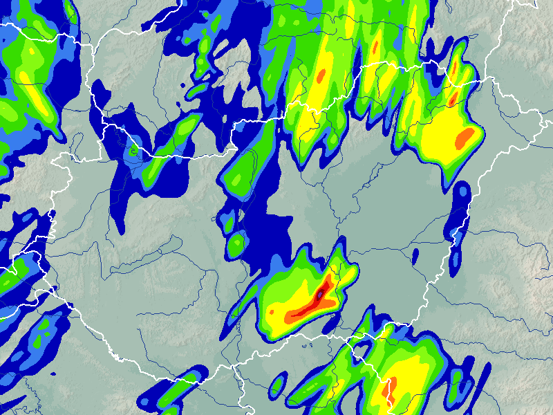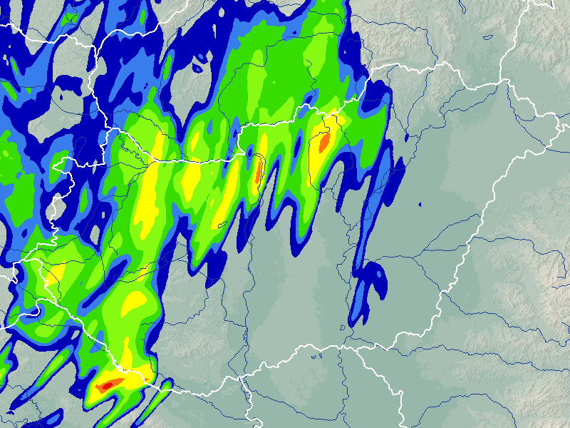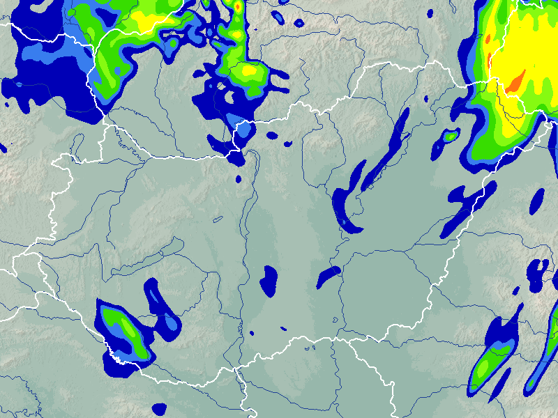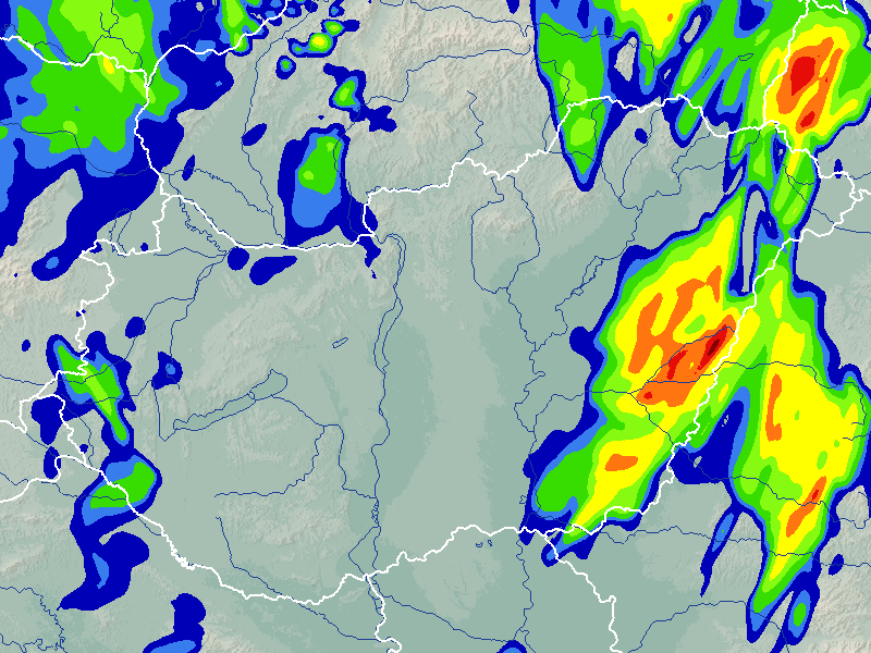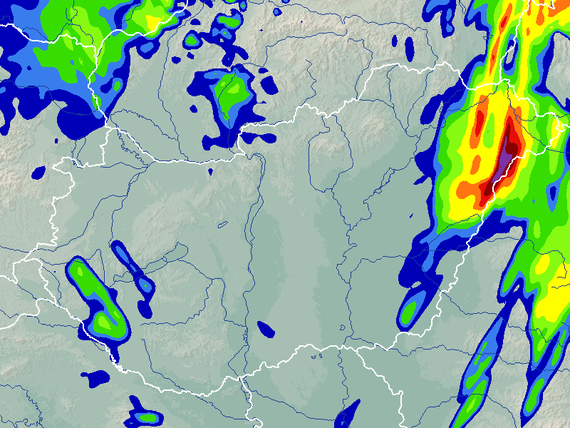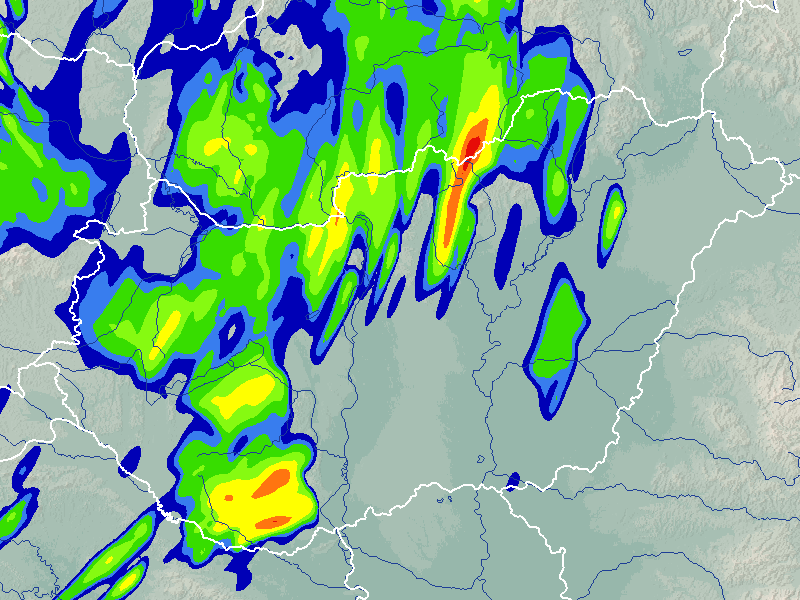 A térképek a csapadék intenzitását jelölik. A kékes árnyalatok gyenge, a zöldes közepes, míg a sárga és piros színek erős csapadékintenzitást jeleznek.