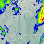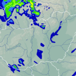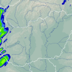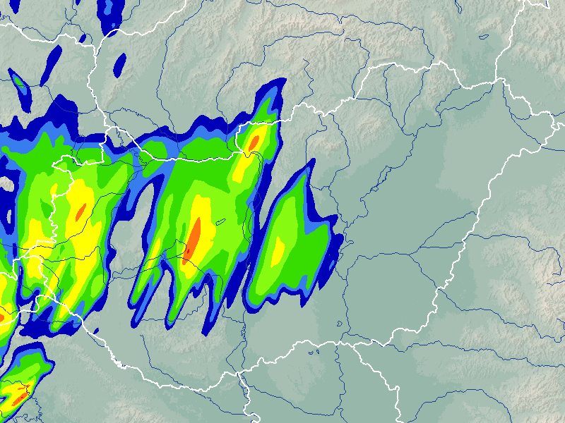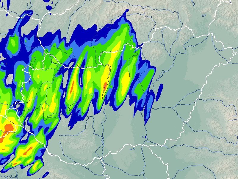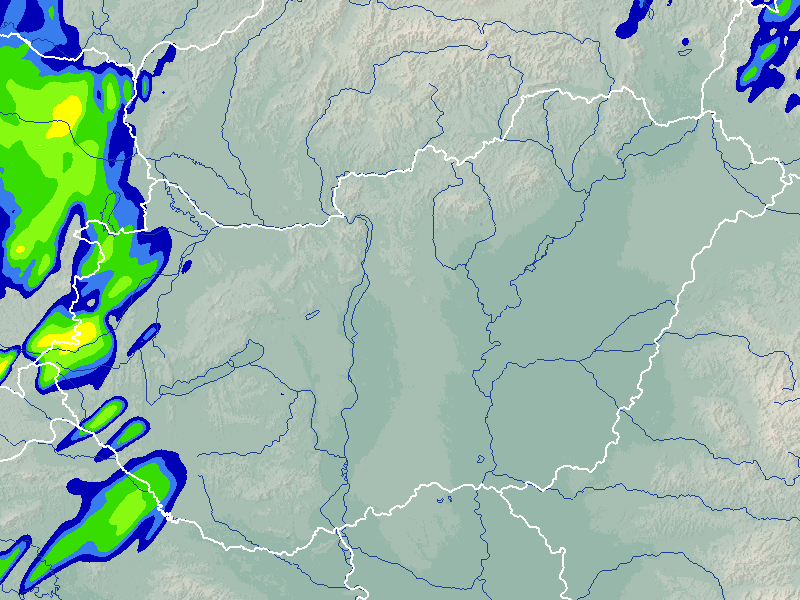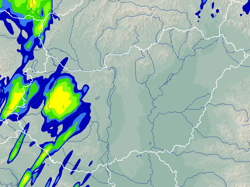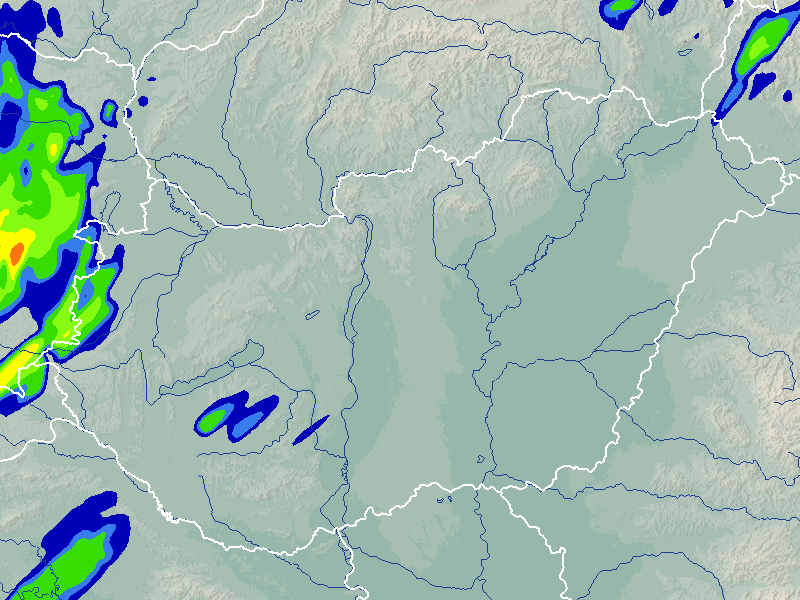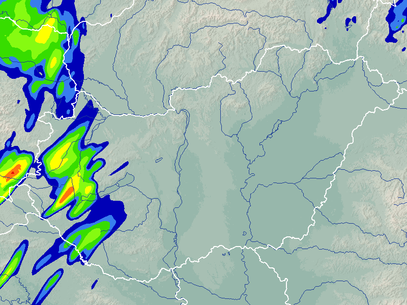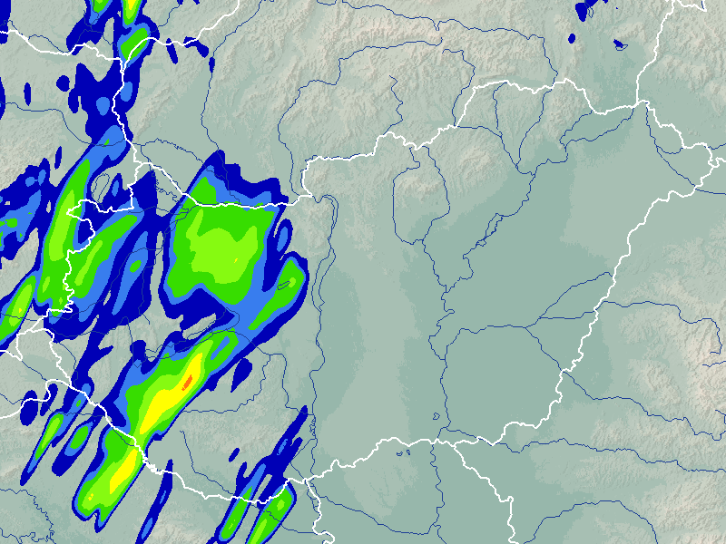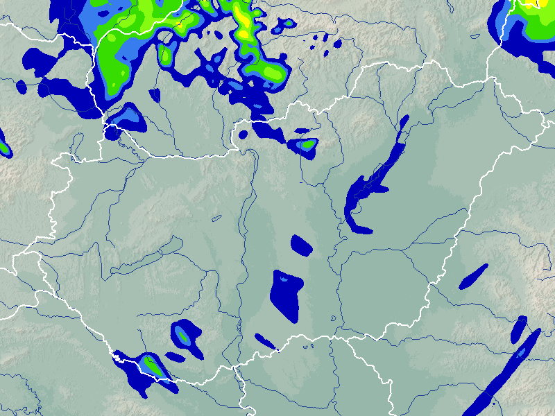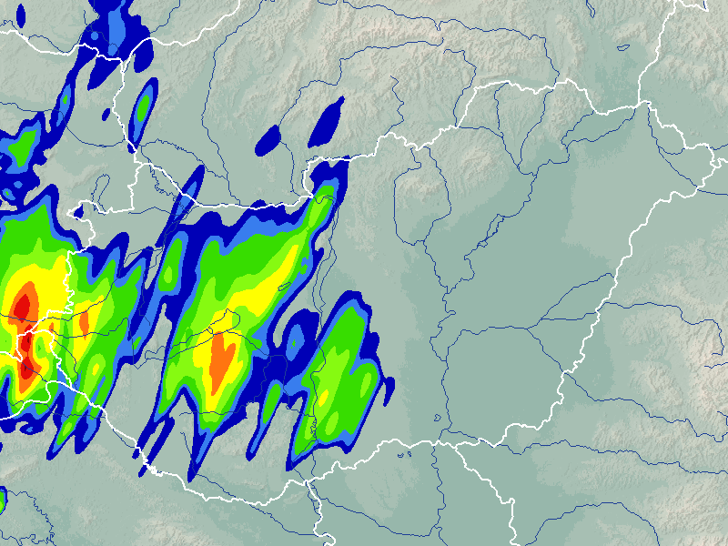 A térképek a csapadék intenzitását jelölik. A kékes árnyalatok gyenge, a zöldes közepes, míg a sárga és piros színek erős csapadékintenzitást jeleznek.