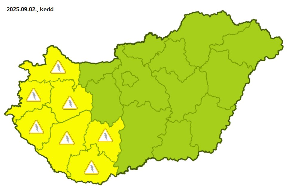 2025. szeptember. 02 10:03Kedden délután nyugat felől újabb hidegfront közelíti meg hazánkat, amelynek hatására a nyugati országrészben kedvezővé válnak az időjárási feltételek zivatarok kialakulásához.