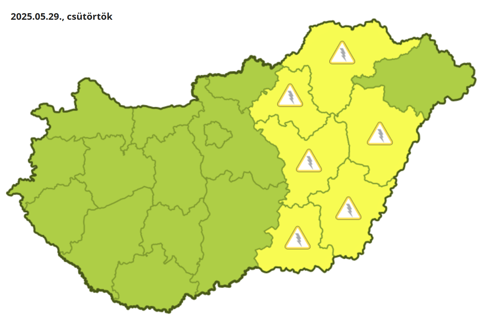 Csütörtökön a déli óráktól estig hozzávetőlegesen az Eger-Szeged vonaltól keletre egy kiépülő konvergencia mentén szórványosan alakulhatnak ki zivatarok, néhol lokálisan jelentősebb mennyiségű csapadék (15-20 mm), aprószemű jég (< 2 cm) és szélerősödés kíséretében. Napközben a Dunántúlon kis valószínűség mellett egy-egy zivatar is kialakulhat, melyet ~70 km/h-s széllökések is kísérhetnek északnyugati irányból.
