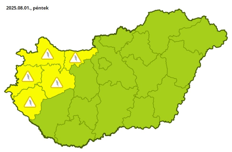 A zivatarok veszélyes kísérőjelenségei miatt elsőfokú figyelmeztetést adott ki a Hungaromet a pénteki napra vonatkozóan Győr-Moson-Sopron, Komárom-Esztergom, Vas, Veszprém és Zala vármegyére.