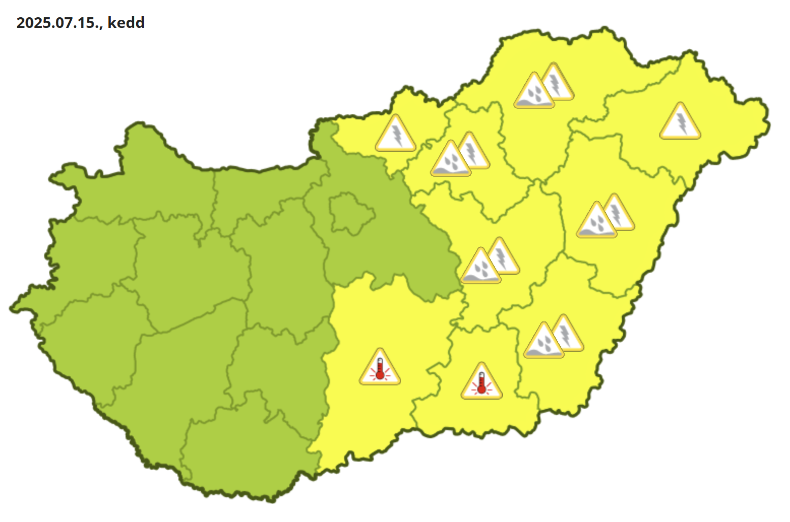 Kedden zivatarveszély miatt került ki az elsőfokú figyelmeztetés Nógrád, Heves, Borsod-Abaúj-Zemplén, Szabolcs-Szatmár-Bereg, Hajdú-Bihar, Jász-Nagykun-Szolnok és Békés vármegyére, de az ország keleti részén, Heves, Borsod-Abaúj-Zemplén, Hajdú-Bihar, Jász-Nagykun-Szolnok és Békés vármegyében felhőszakadással kiegészülve. A meleg Bács-Kiskun és Csongrád-Csanád vármegyére korlátozódik már.