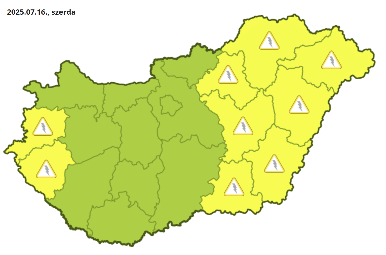 Elsőfokú figyelmeztetést adott ki a HungaroMet a zivatarok és azok veszélyes kísérőjelenségei miatt Vas, Zala, Heves, Borsod-Abaúj-Zemplén, Szabolcs-Szatmár-Bereg, Hajdú-Bihar, Jász-Nagykun-Szolnok, Békés és Csongrád-Csanád vármegyére.