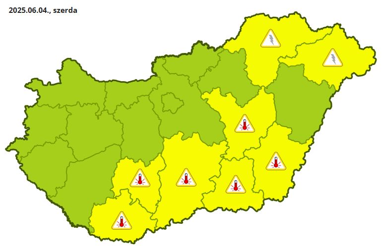Szerdán az északkeleti megyékben kis valószínűség mellett egy-egy zivatar előfordulhat, emiatt Szabolcs-Szatmár-Bereg és Borsod-Abaúj-Zemplén vármegyében elsőfokú figyelmeztetés érvényes. Szerdán a Dél-Alföldön már nagyobb területen alakulhat 25 fok fölött a napi középhőmérséklet, emiatt Baranya, Tolna, Bács-Kiskun, Jász-Nagykun-Szolnok, Csongrád-Csanád és Békés vármegyében elsőfokú figyelmeztetés érvényes.