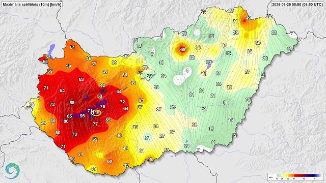 Március 29-én, vasárnap a délelőtti órákban a Hungaromet három mérőállomásán is átlépte a szélsebesség a 30 m/s-os (108 km/h) határt. Ezzel hivatalosan is a múlté lett a 2012-es rekord, amelyet akkor a Bakony csúcsán, Kab-hegyen regisztráltak 29,3 m/s-mal (105,5 km/h). Az új csúcstartó Balatonőszöd lett, ahol döbbenetes, 33,1 m/s-os (119,2 km/h) lökést mértek a műszerek. A dobogó második fokára Kab-hegy állhatott fel 32,0 m/s-mal (115,2 km/h), míg Öskün 30,8 m/s-os (110,9 km/h) szél szaggatott.