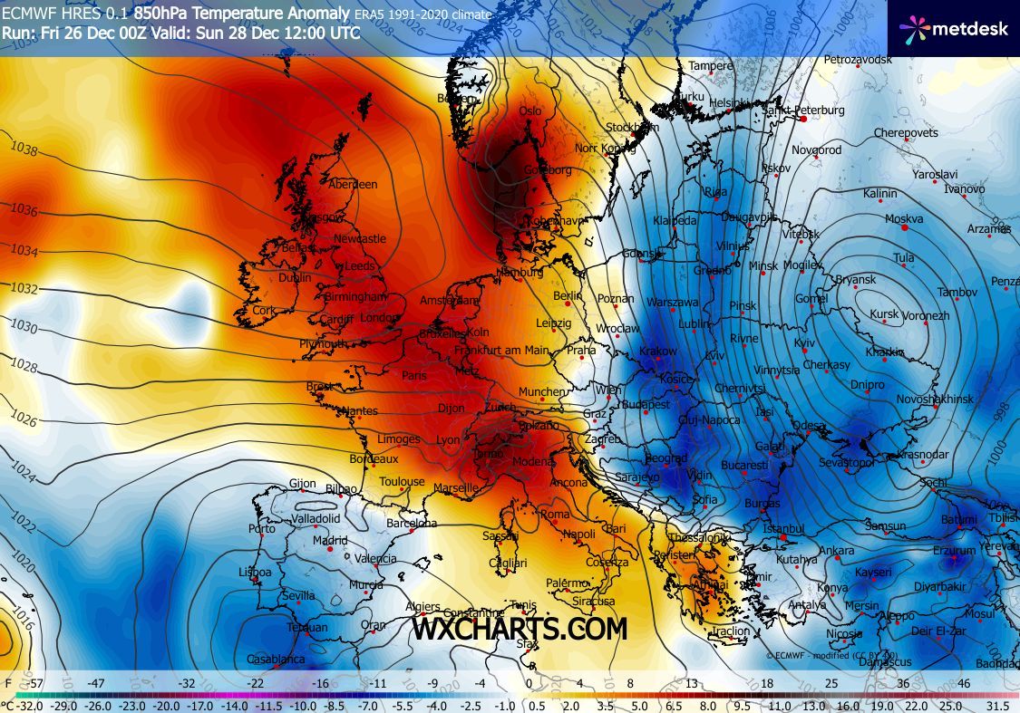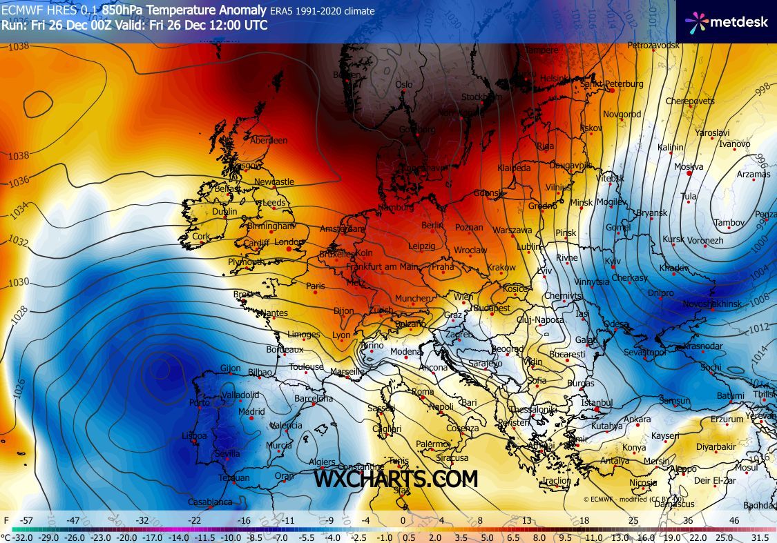 December 26-án pénteken Európa nagy részét, így a Kárpát-medencét is narancssárga és vörös színek borítják, a hőmérséklet jellemzően az átlagos felett alakul. Magyarországon szintén pozitív hőmérsékleti anomália látható. Ez azt jelenti, hogy az ilyenkor szokásosnál melegebb légtömeg helyezkedik el az ország felett. A hőmérséklet az átlagos kevéssel az átlag felett alakul.