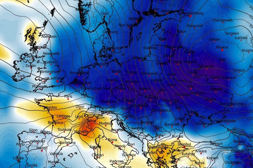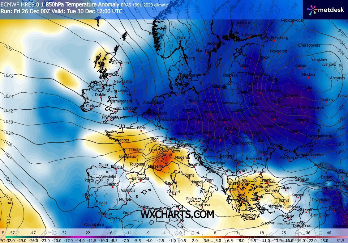 December 30. keddre drasztikus változáson megy keresztül a kontinens időjárása. A térképen látható kék színű (hideg) terület benyomul Közép-Európába, kiszorítva a meleget délnyugat felé. Hazánk felett tovább erősödik a hideg (kék) anomália. A hőmérséklet több fokkal az átlag alá süllyed, folytatódik a markáns lehűlés, a magasban beáramló hideg levegővel.