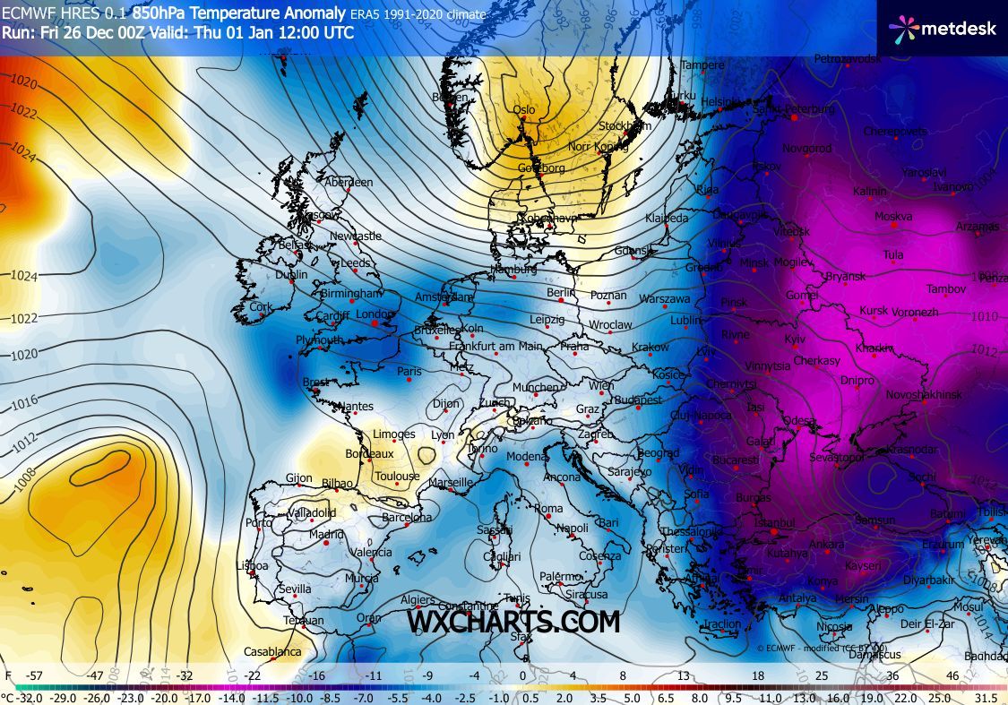 Az újév első napjára a hideg légtömeg (lila/sötétkék színek) teljesen elárasztja Kelet- és Közép-Európát. Magyarország továbbra is a negatív anomália zónájában helyezkedik el. Ez erős lehűlést, igazi téli időjárást vetít előre. Kemény éjszakai fagyokat és napközben is fagypont körüli vagy az alatti csúcsértékeket eredményezhet.