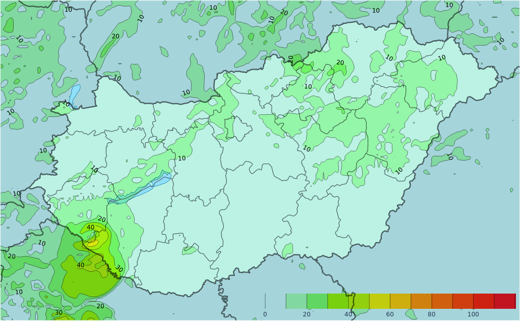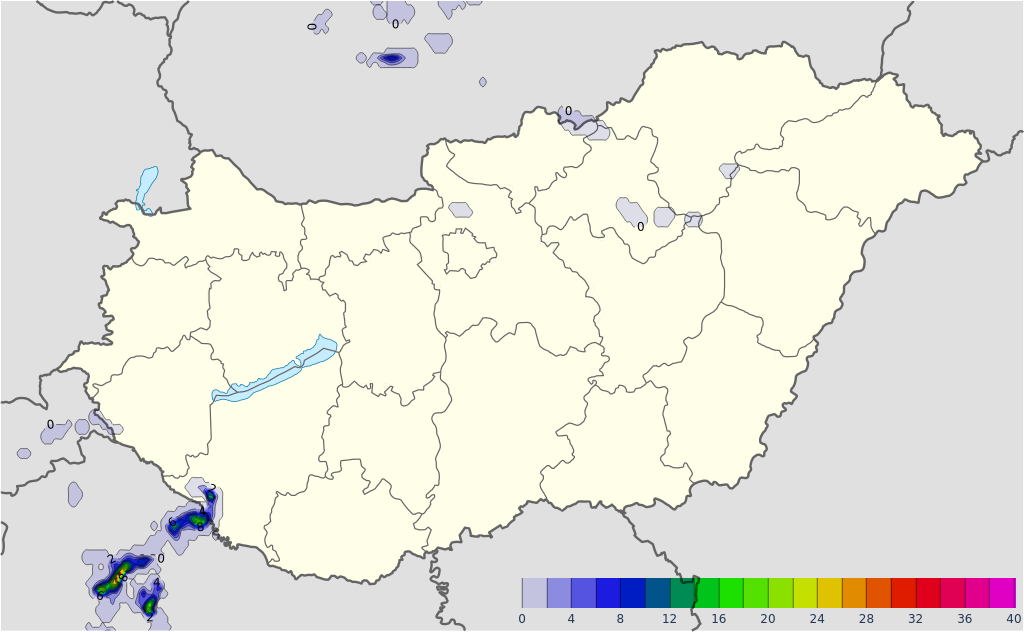 A térképek a csapadék intenzitását jelöli. A világoskék árnyalatok gyenge, a sötétebbek erősebb csapadékintenzitást jeleznek.