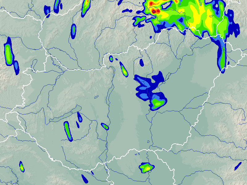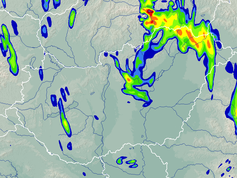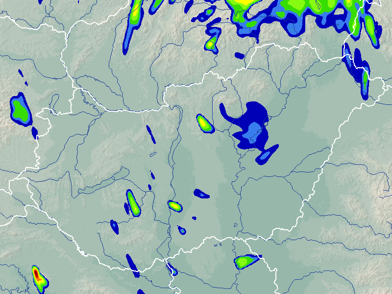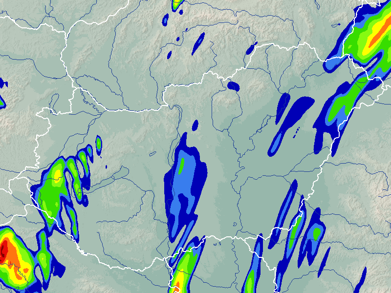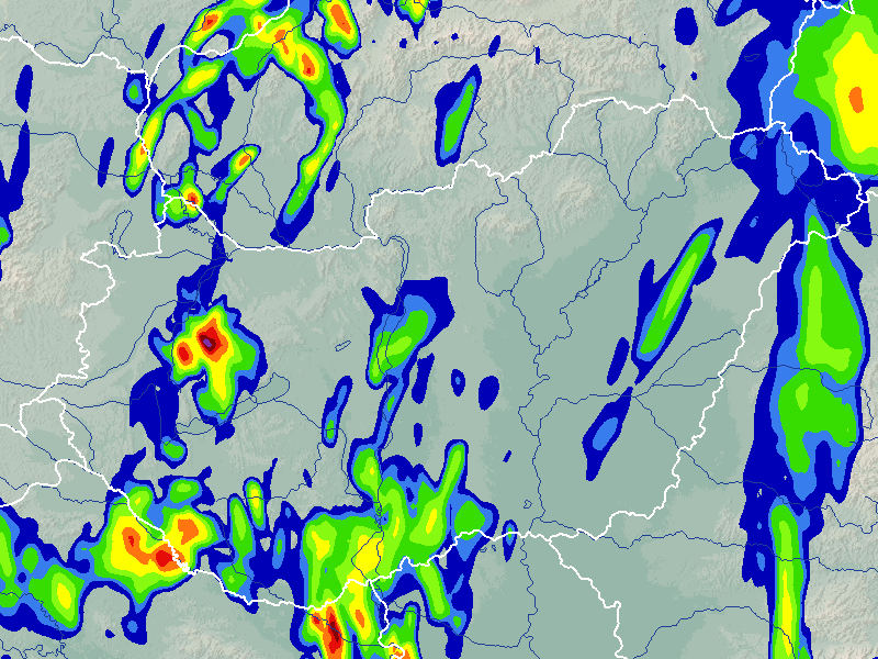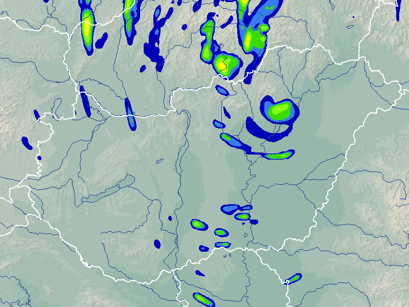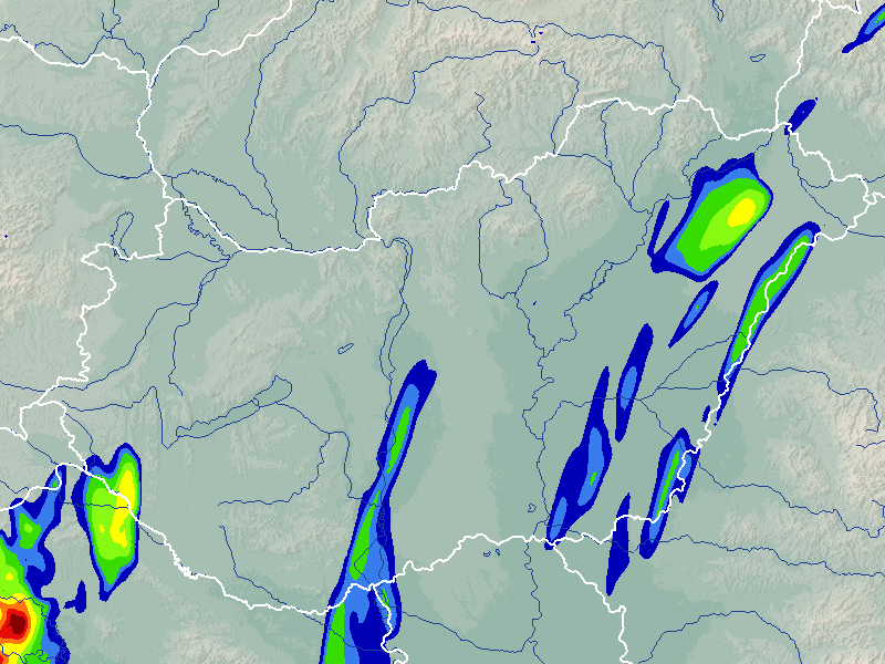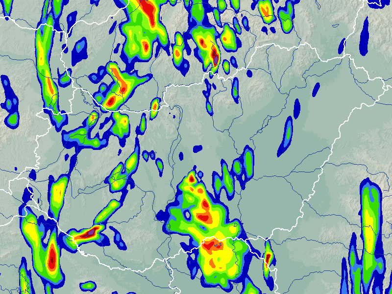 A térképek a csapadék intenzitását jelölik. A kékes árnyalatok gyenge, a zöldes közepes, míg a sárga és piros színek erős csapadékintenzitást jeleznek. Záporos csapadék miatt a gócok elhelyezkedése változhat, de a tendencia így is jól megfigyelhető.