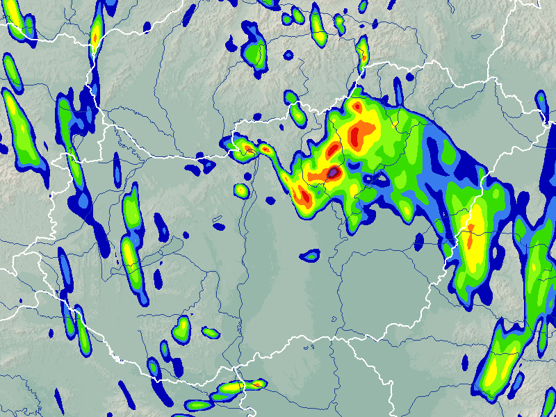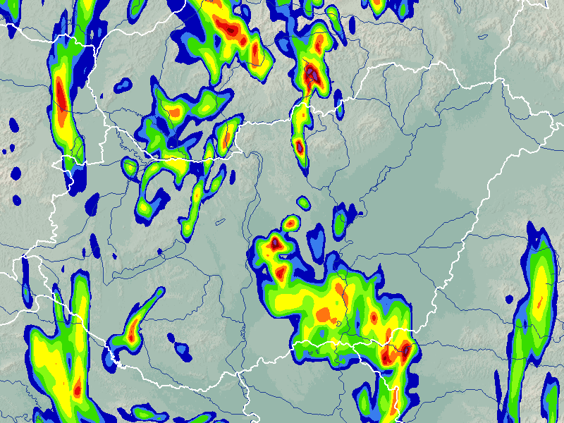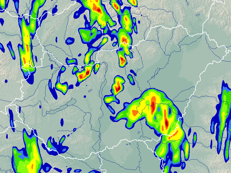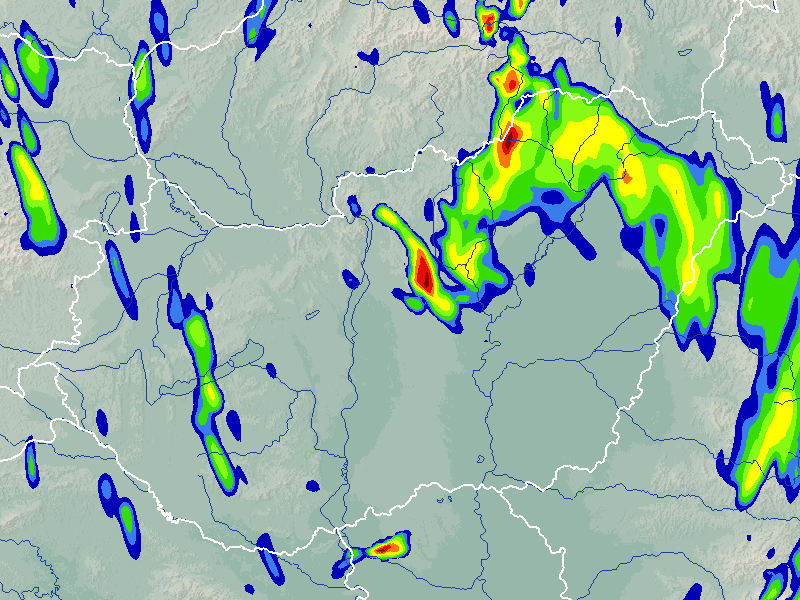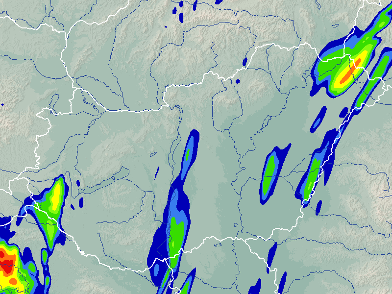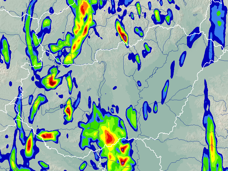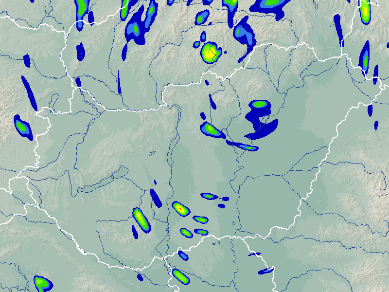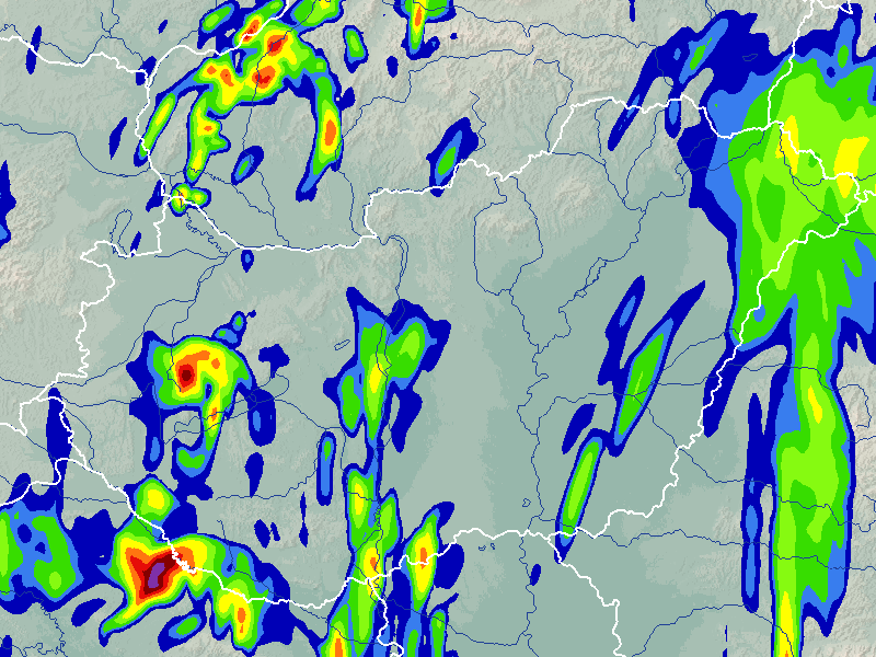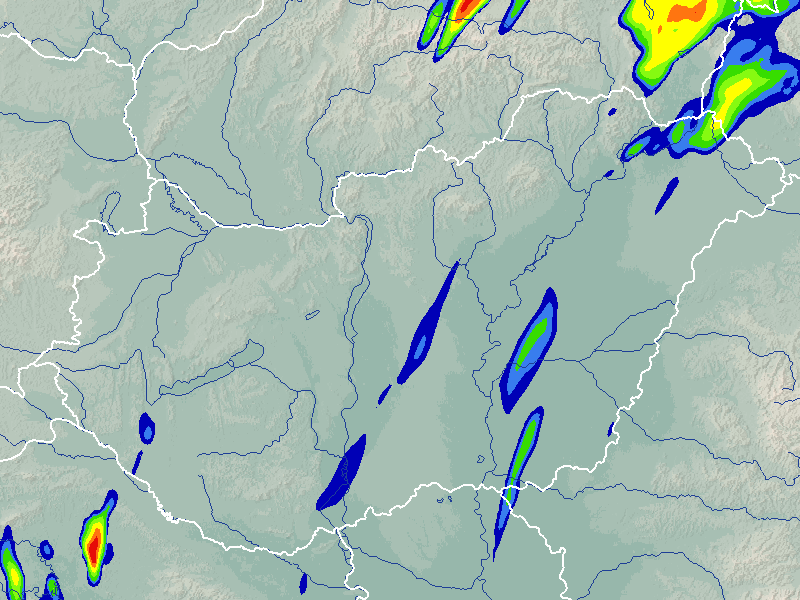 A térképek a csapadék intenzitását jelölik. A kékes árnyalatok gyenge, a zöldes közepes, míg a sárga és piros színek erős csapadékintenzitást jeleznek. Záporos csapadék miatt a gócok elhelyezkedése változhat, de a tendencia így is jól megfigyelhető.